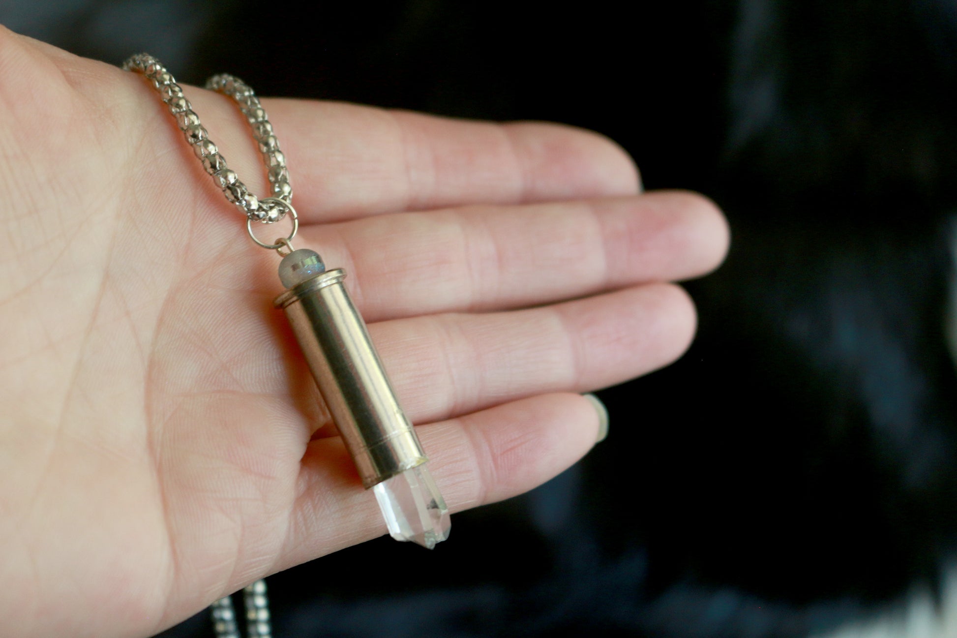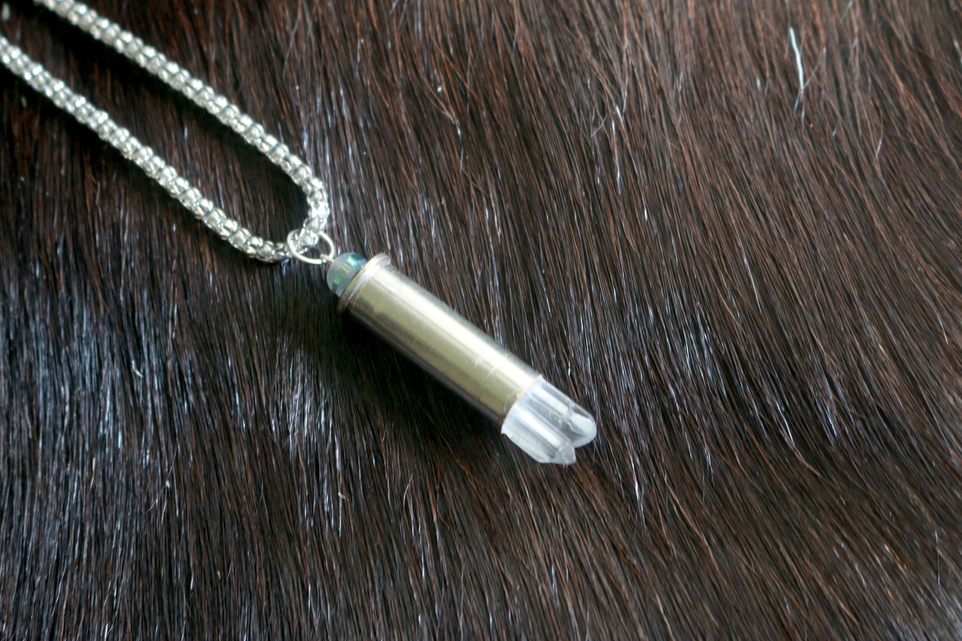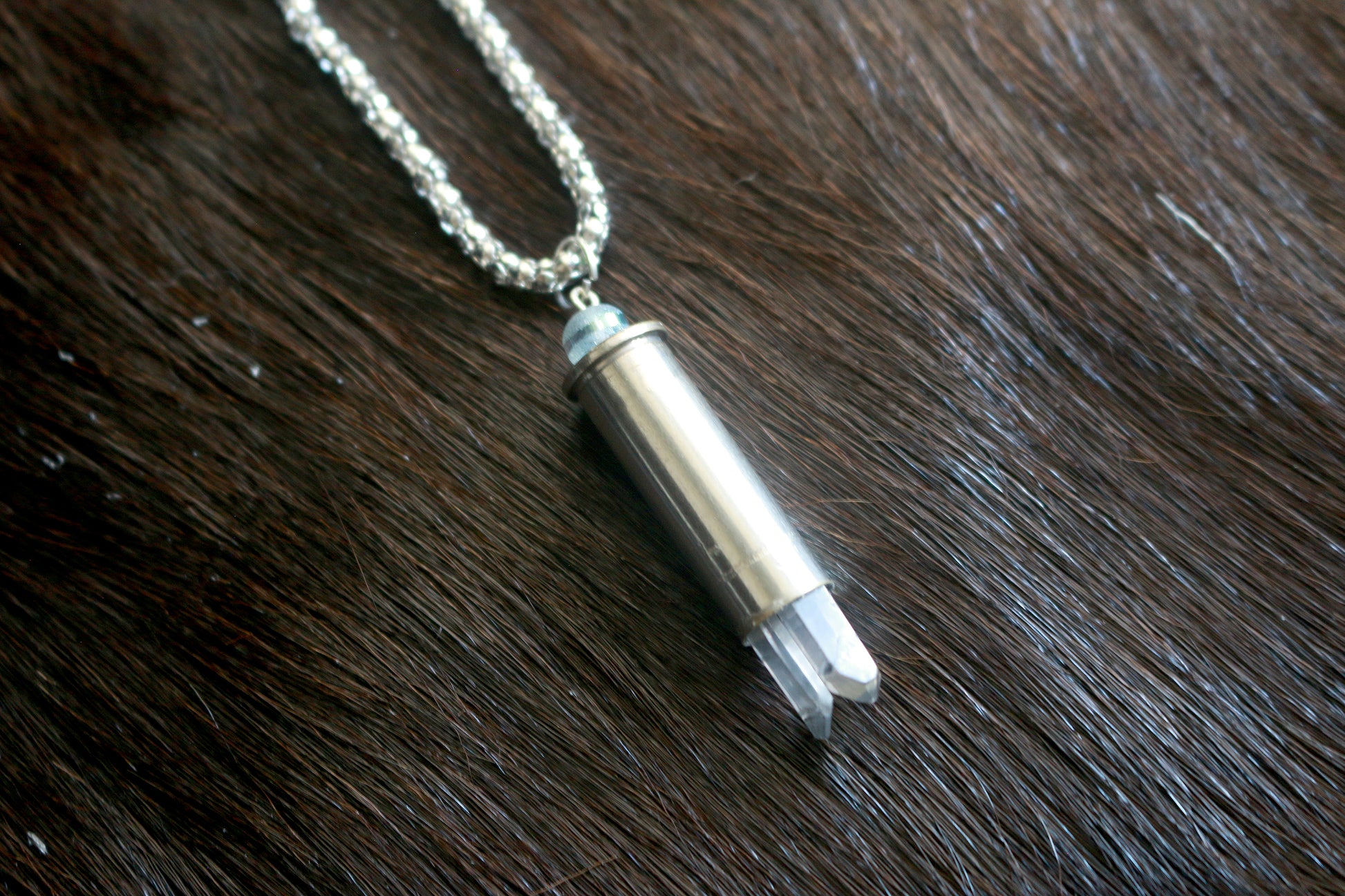 Reclaimed handmade 38 Special bullet shell necklace with quartz crystals. Each bullet is a little under 2" tall.
