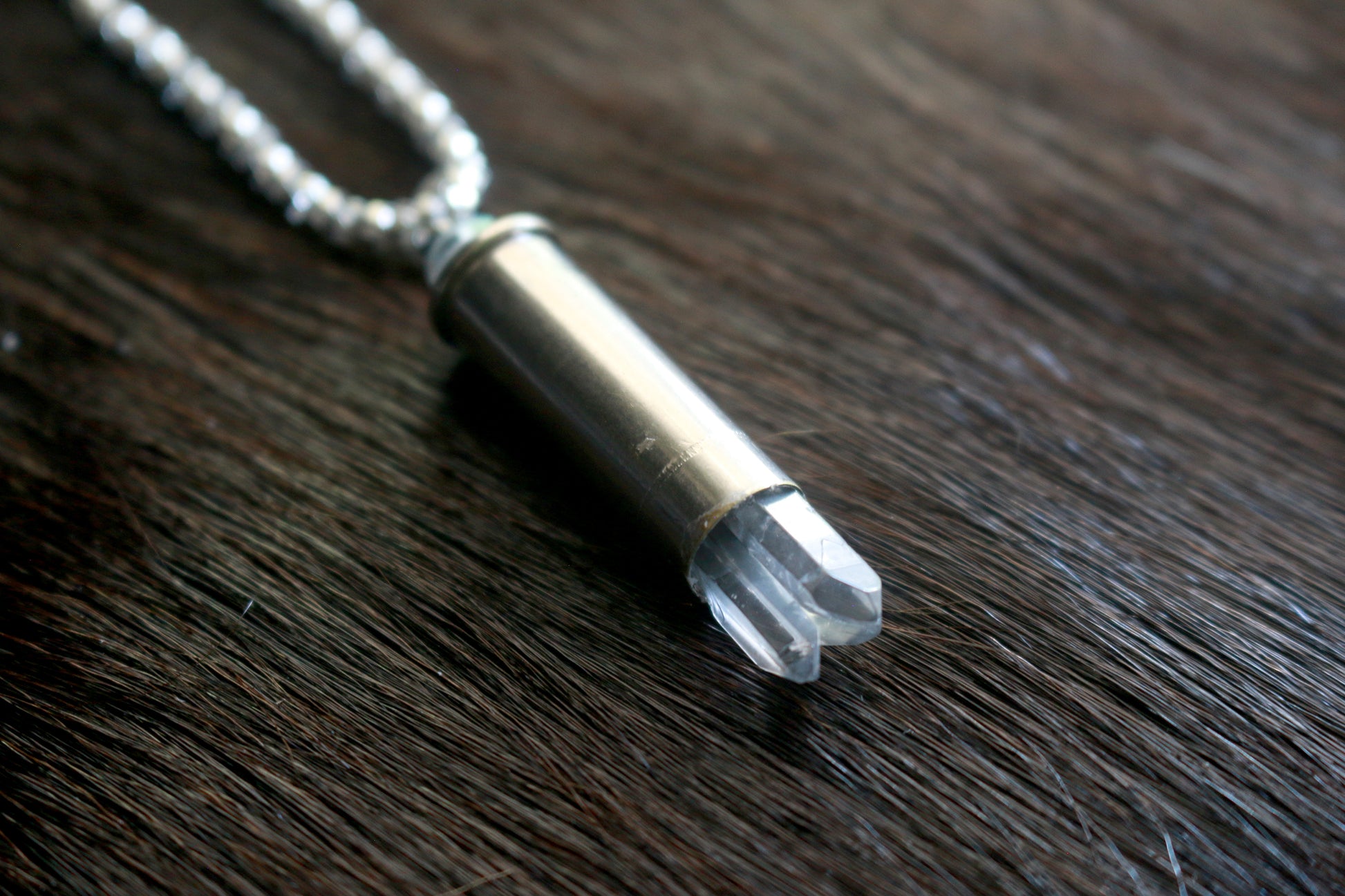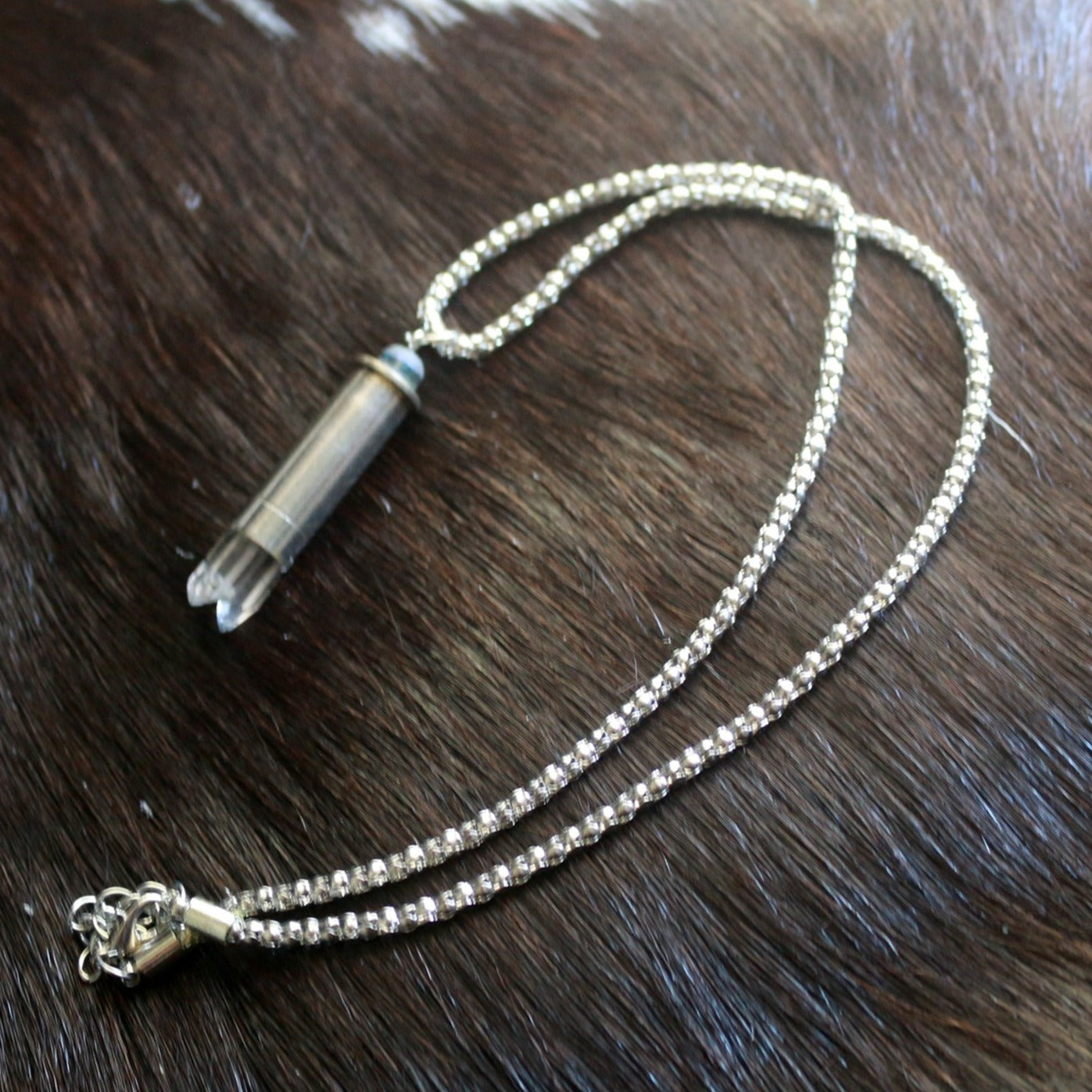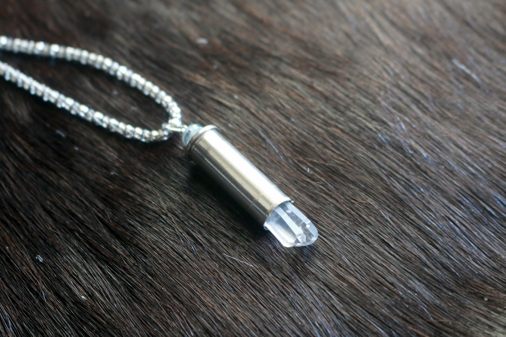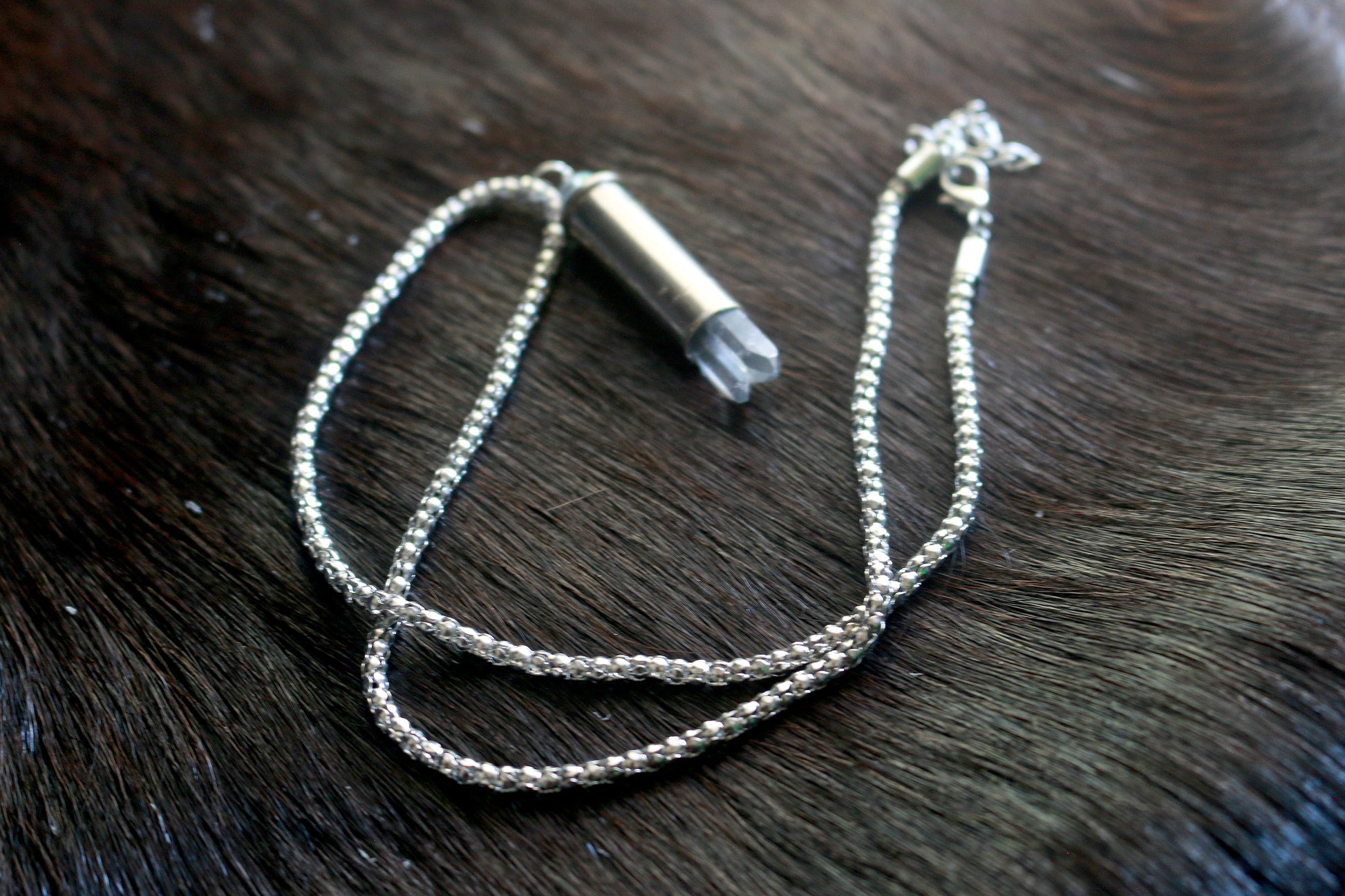 Reclaimed handmade 38 Special bullet shell necklace with quartz crystals. Each bullet is a little under 2" tall.