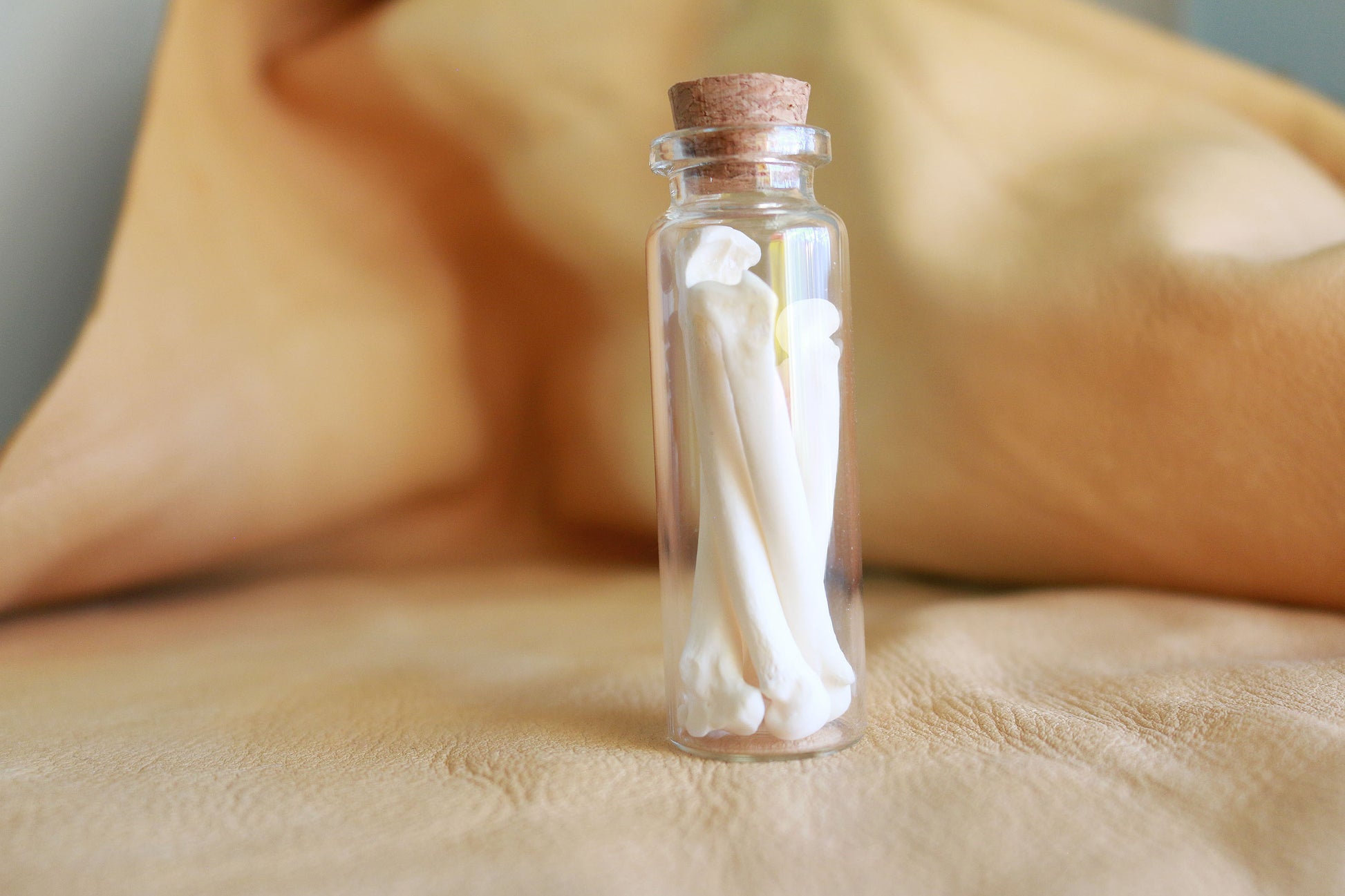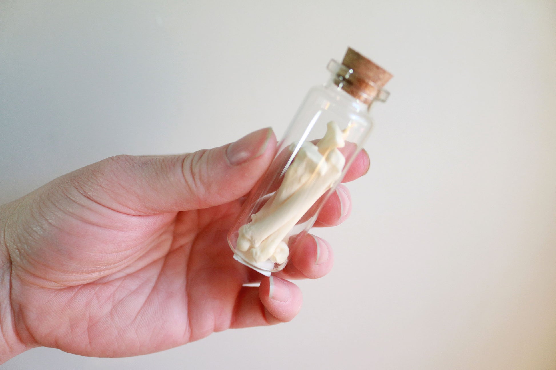 A small charming jar, 2.5" x 1", filled with small oddities & specimen: mixed small bobcat bones.