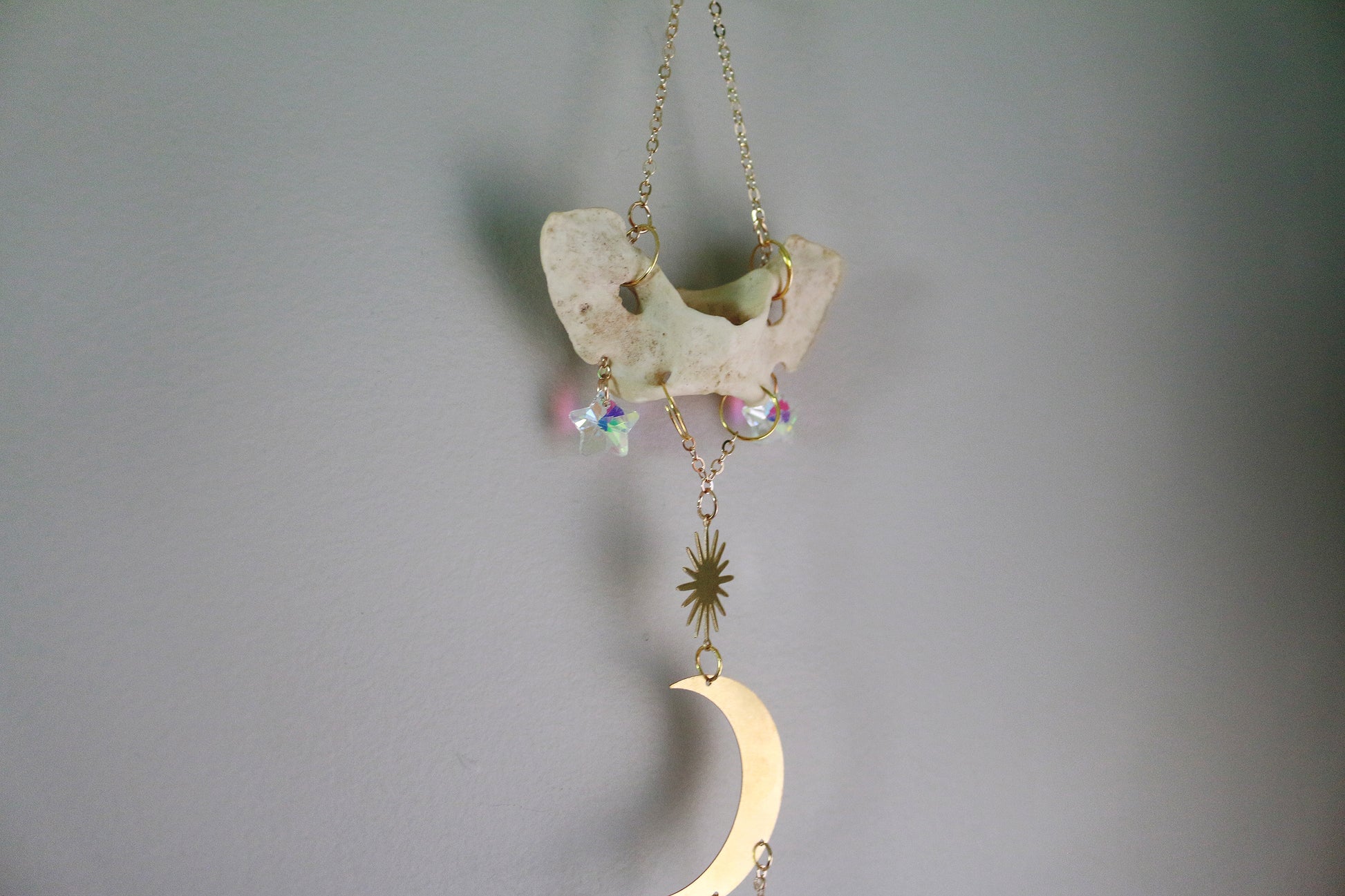The piece measures at 11" from bone to bottom crystal and the bone measures at a little under 3" across.