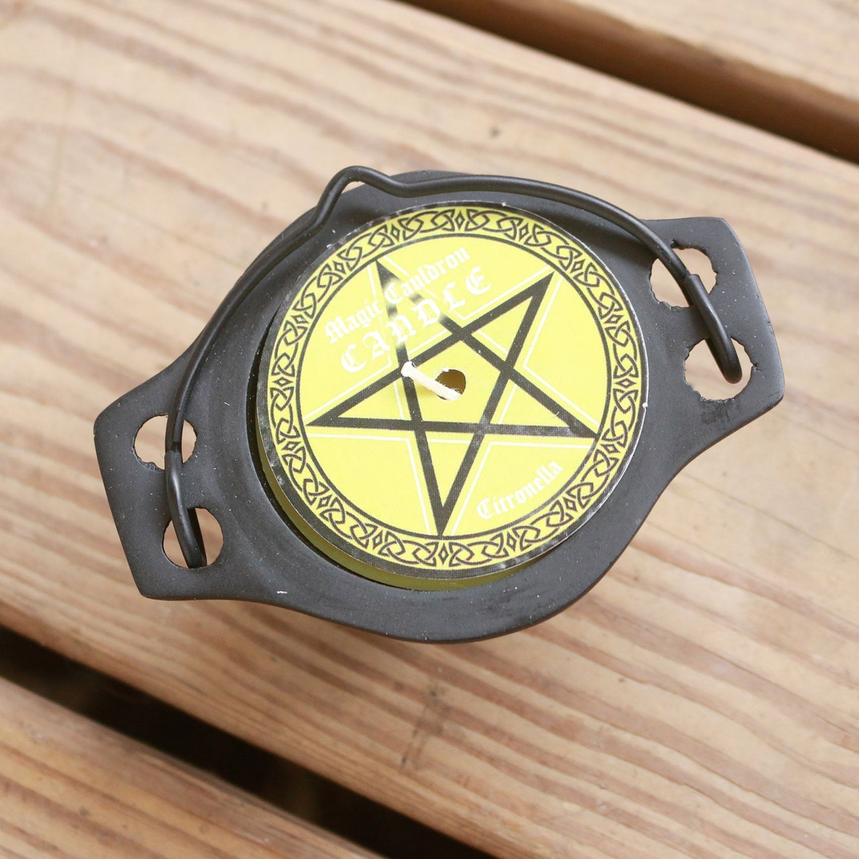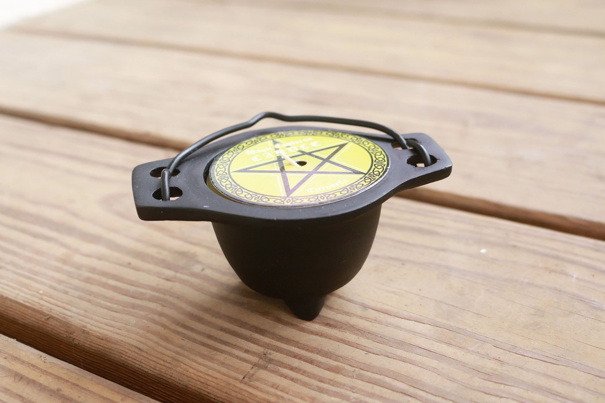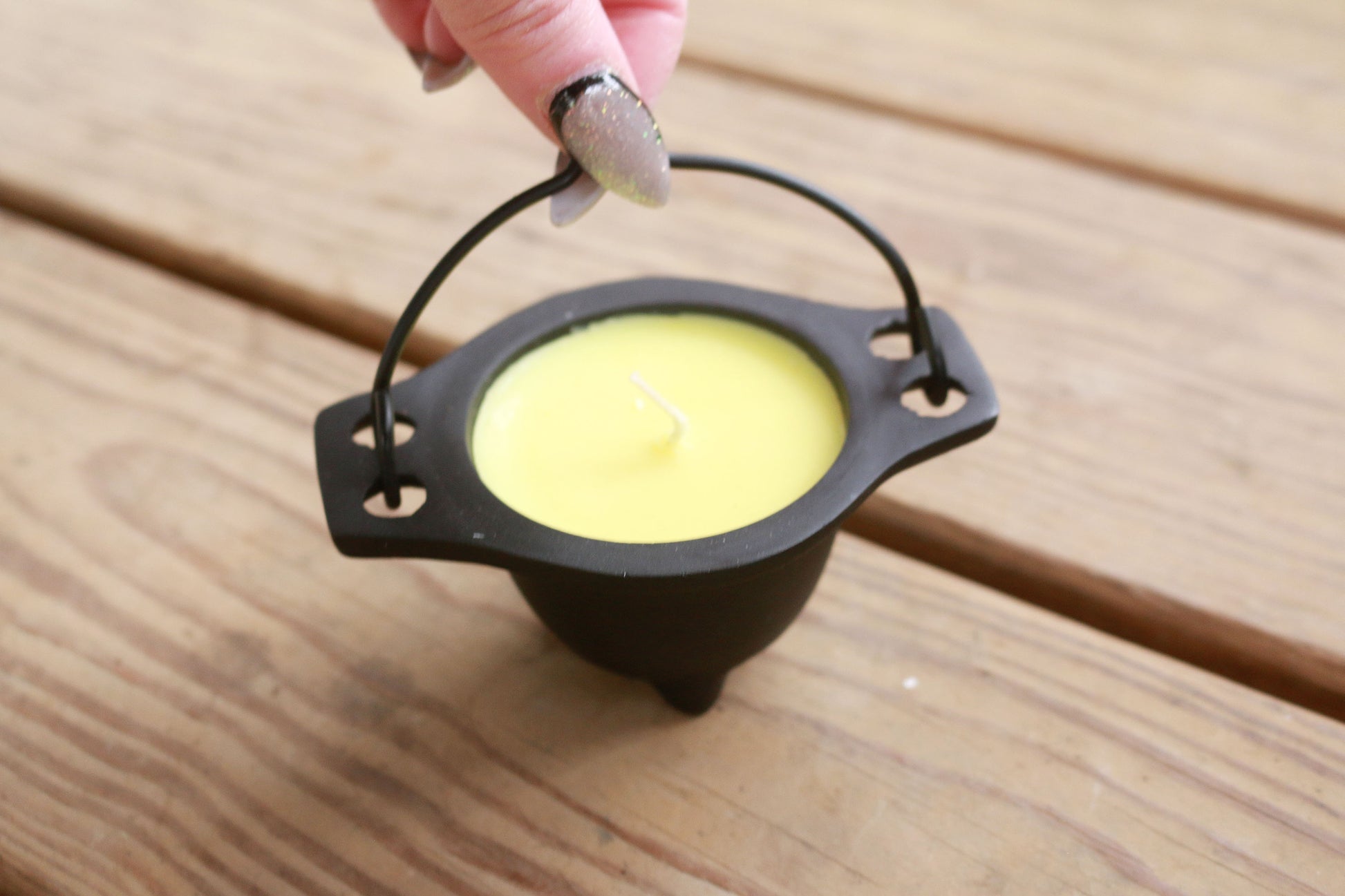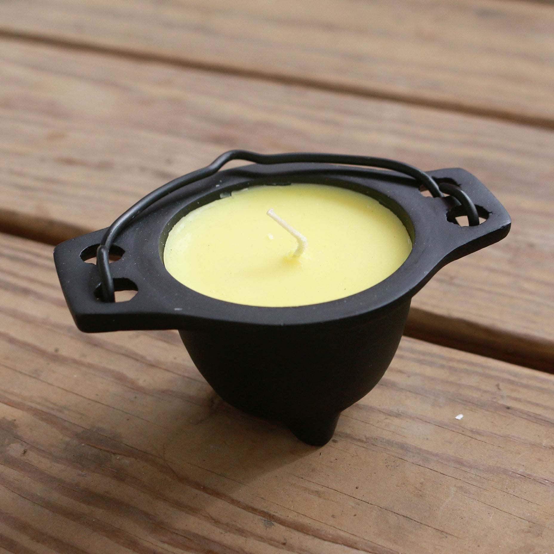4" Cauldron Candle - Citronella. With a burn time of 12 hours and a lead-free wick, in a 1.75 inches in height, 4 inches in width, and 3 inches in diameter cast iron cauldron.