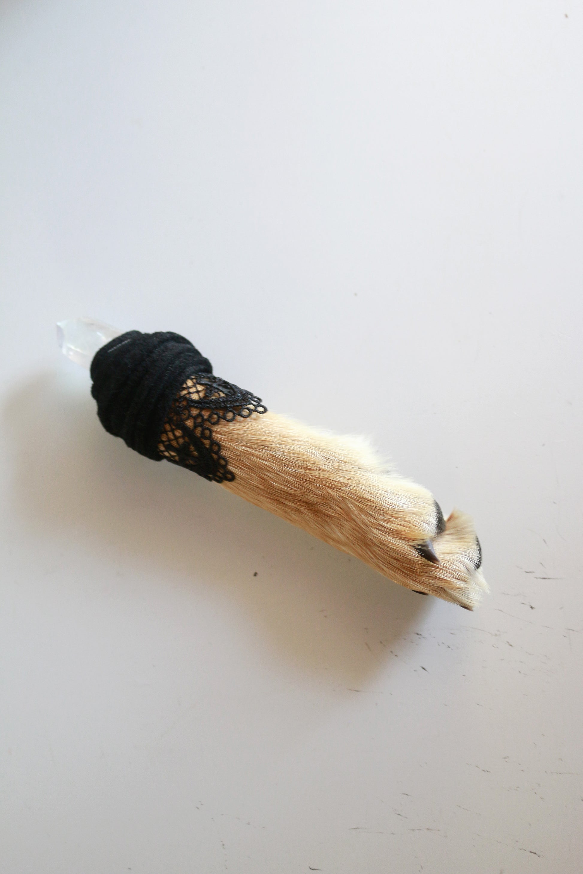 Genuine coyote paw adorned with lace and quartz crystal measures at 7 inches. Perfect for animal magick, ritual tool or display.