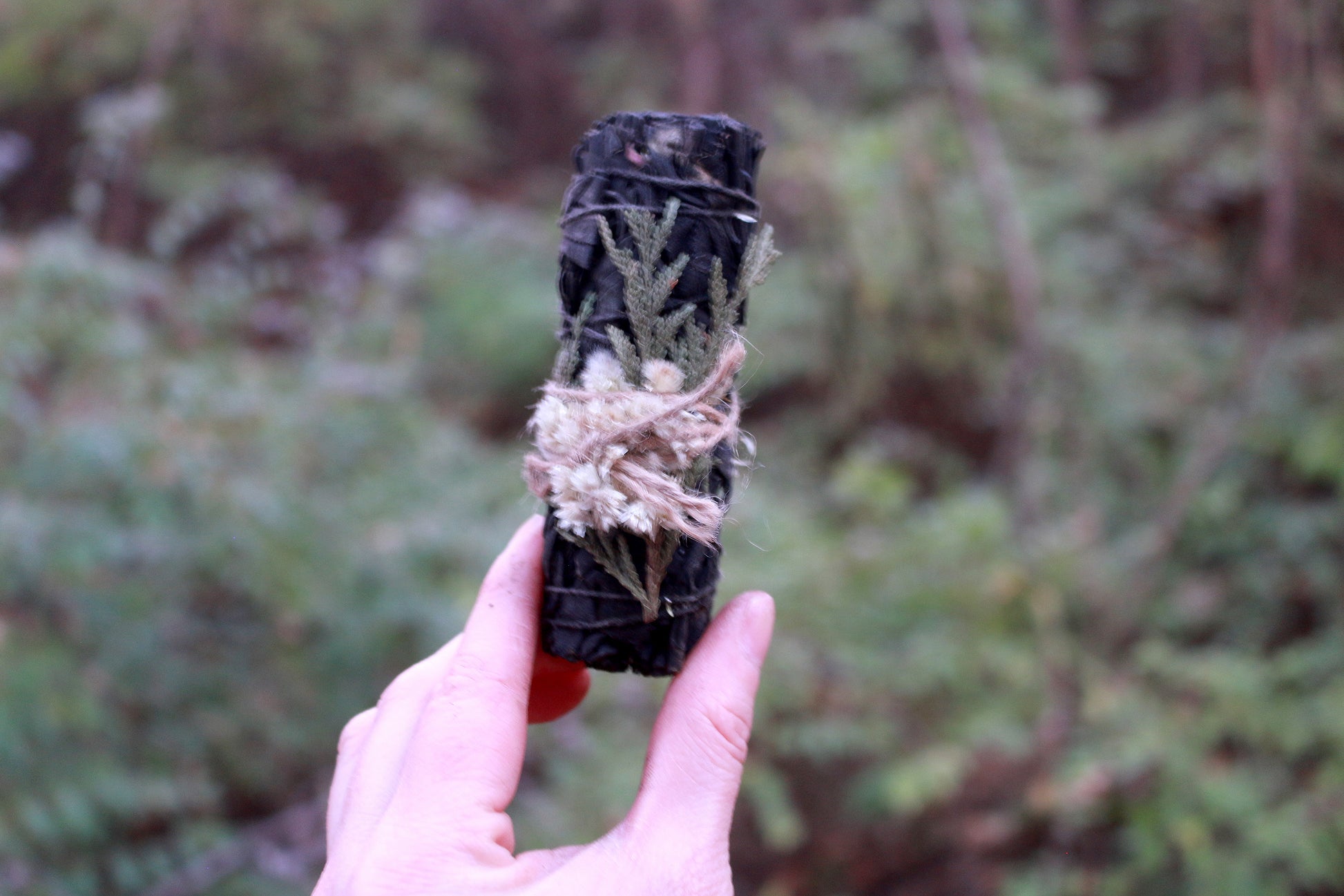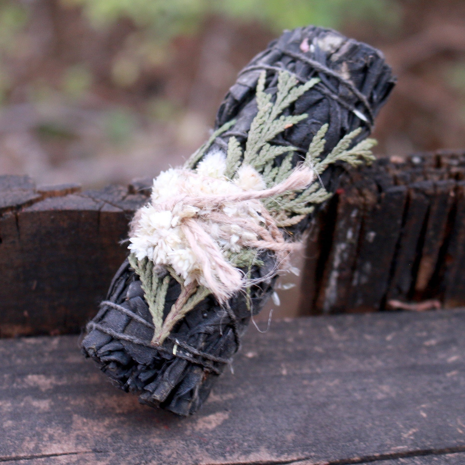 Midnight Bloom White Sage Black Colored White Sage with Cedar and Mullein Size: 4 inch Sourced responsibly in California, white sage (Salvia Apiana) is proven to neutralize negative energy, kill harmful bacteria, improve sleep, alleviate anxiety and stress. When burned the smoke heals and brings one back into balance and cleanses the body and mind of negative spirits and impurities. Smudging sage has also been known globally to help relieve worry, open the mind, clear negative thoughts and feelings, and de-stress the spirit.