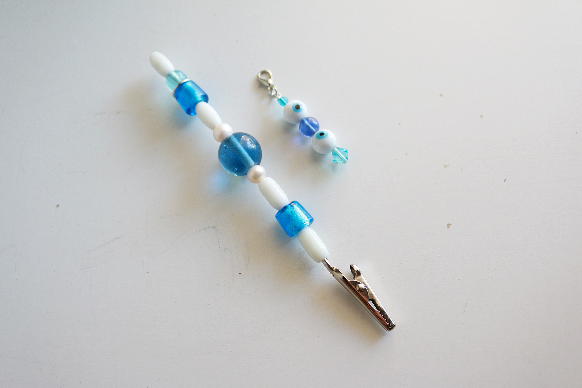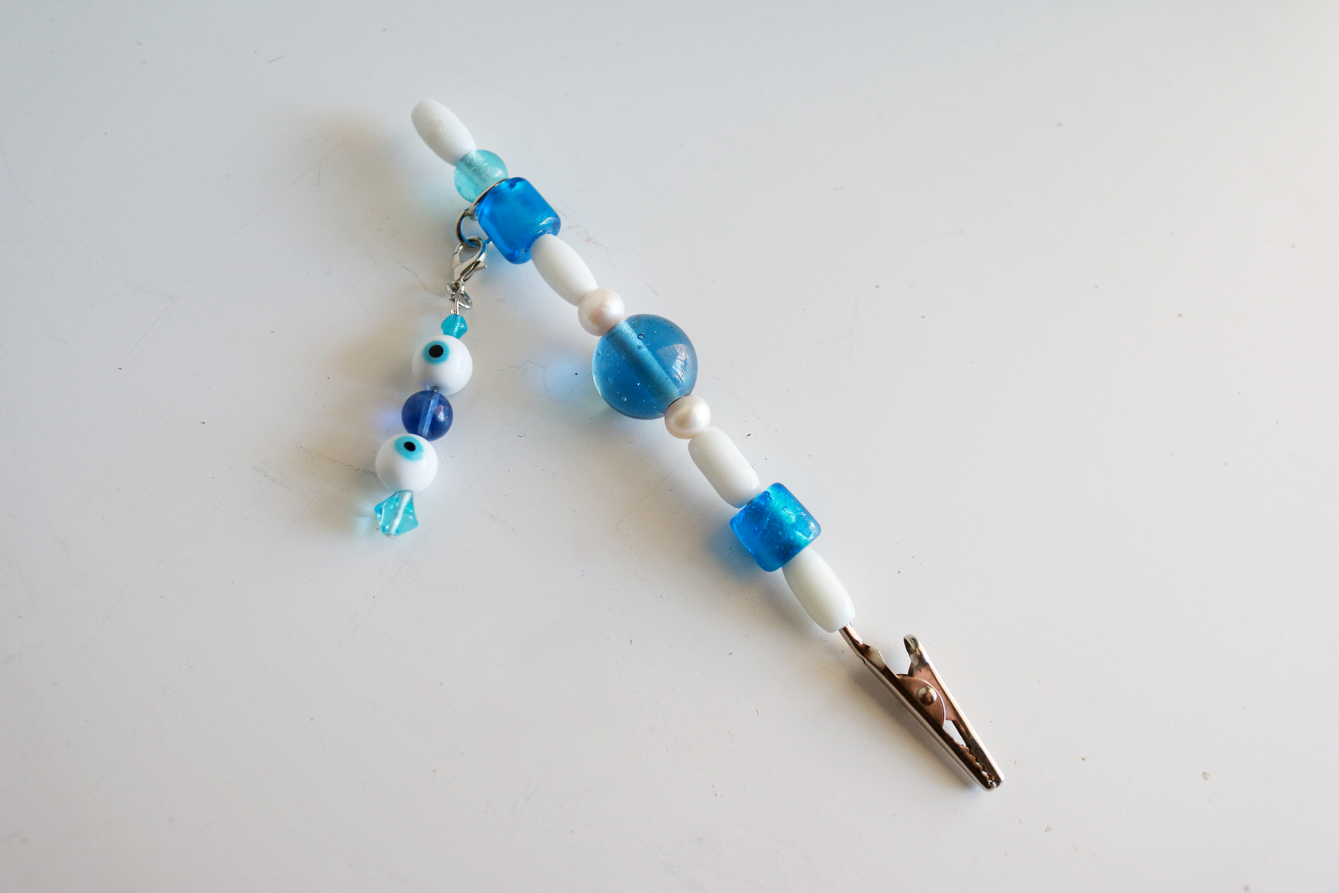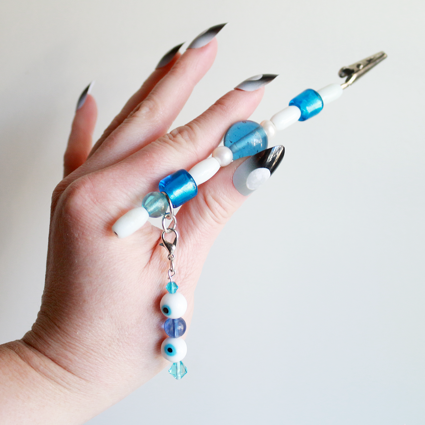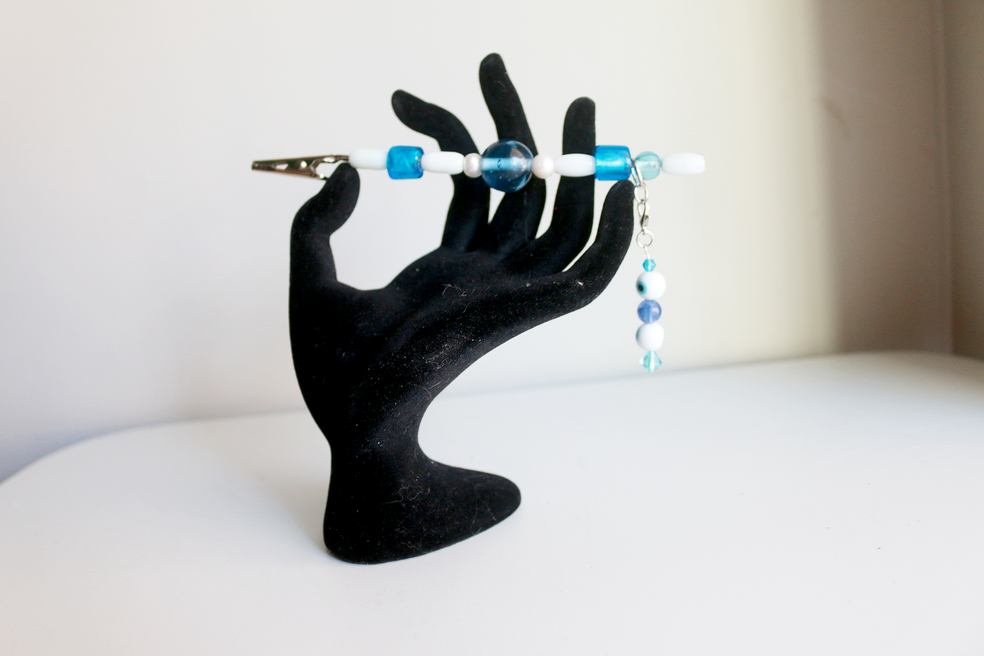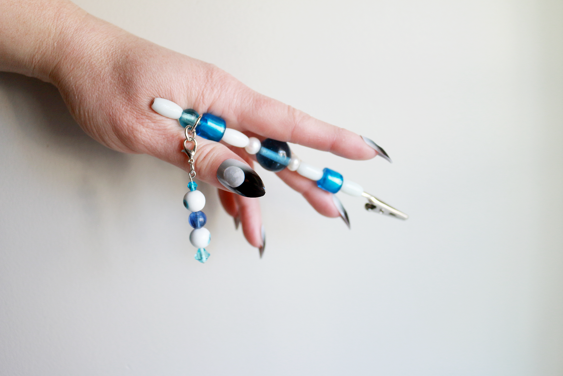Handmade at 6" long with a removeable dangle end piece, hanging at 2" long. Each clip is hand beaded with high quality glass and real pearl beading.