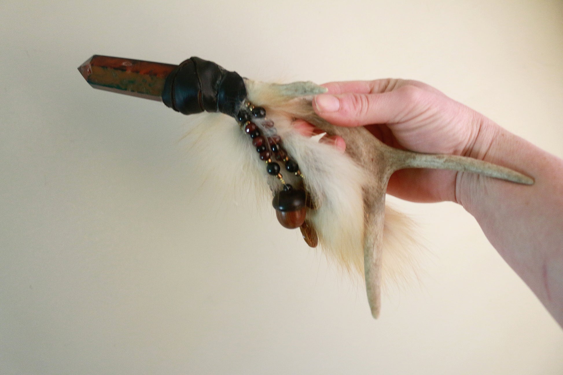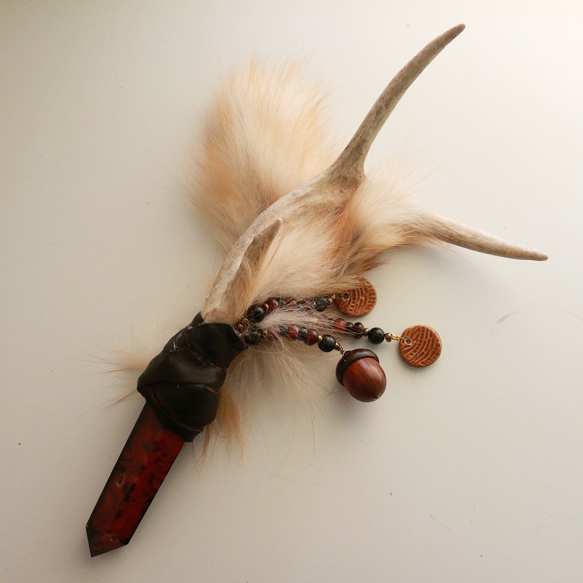 This piece is created with a sardonyx crystal topped on a deer antler base, wrapped in leather with fox fur accents, lampwork and obsidian beading. It measures at 11 inches from crystal tip to horn base and sits about 1.5 inches wide.