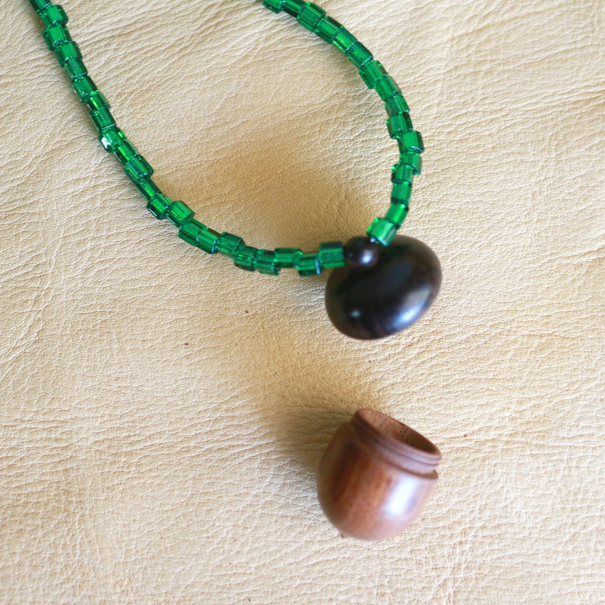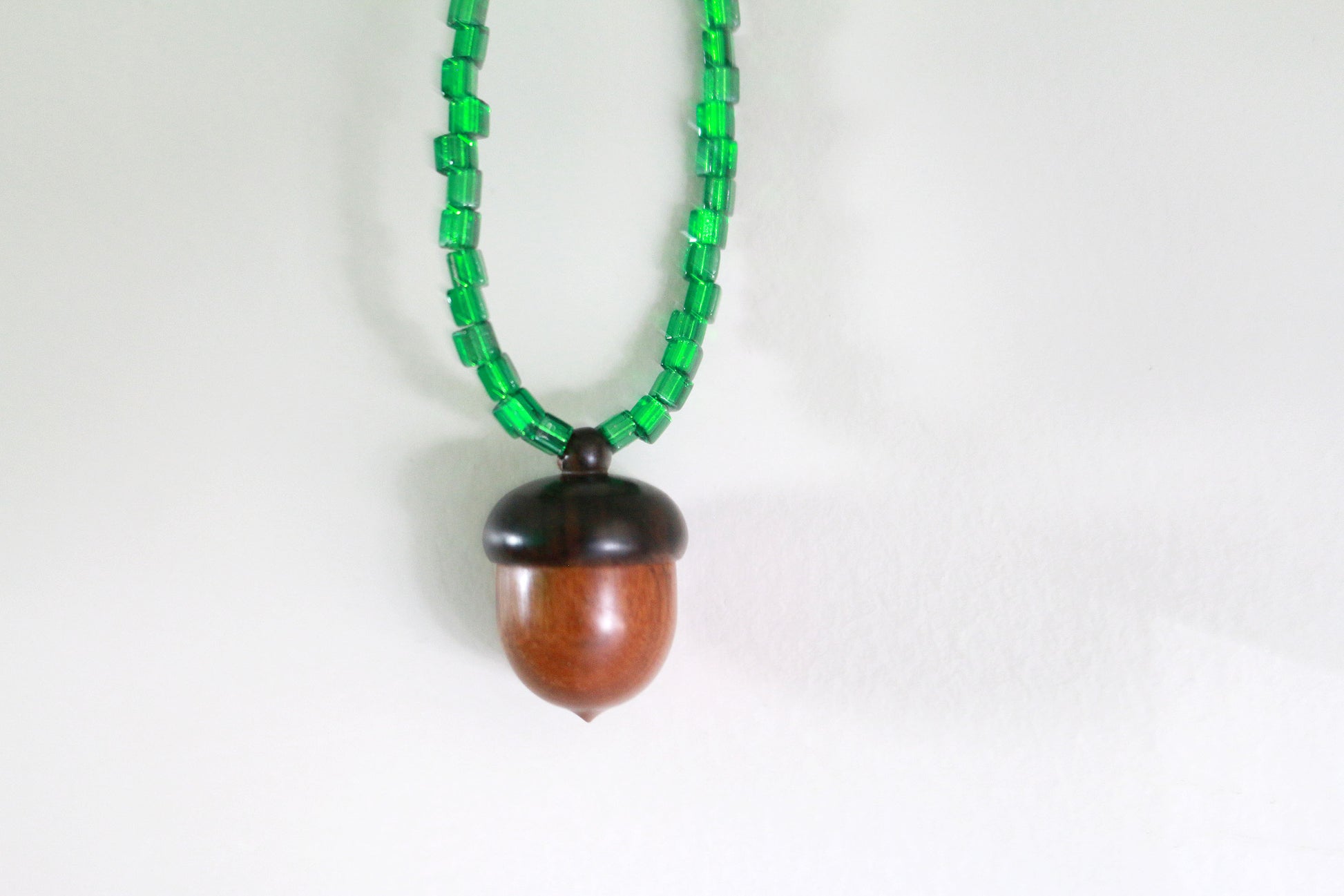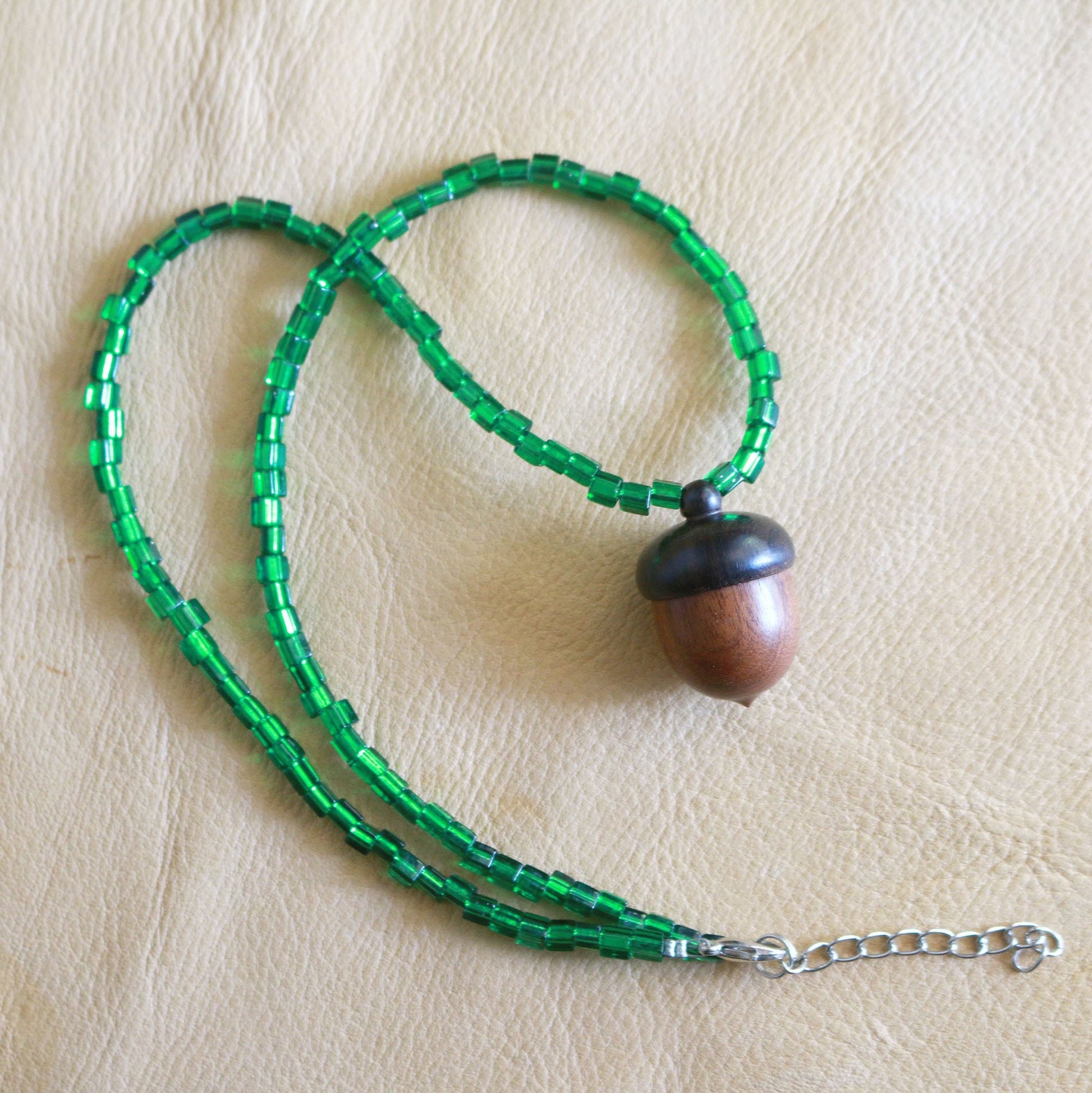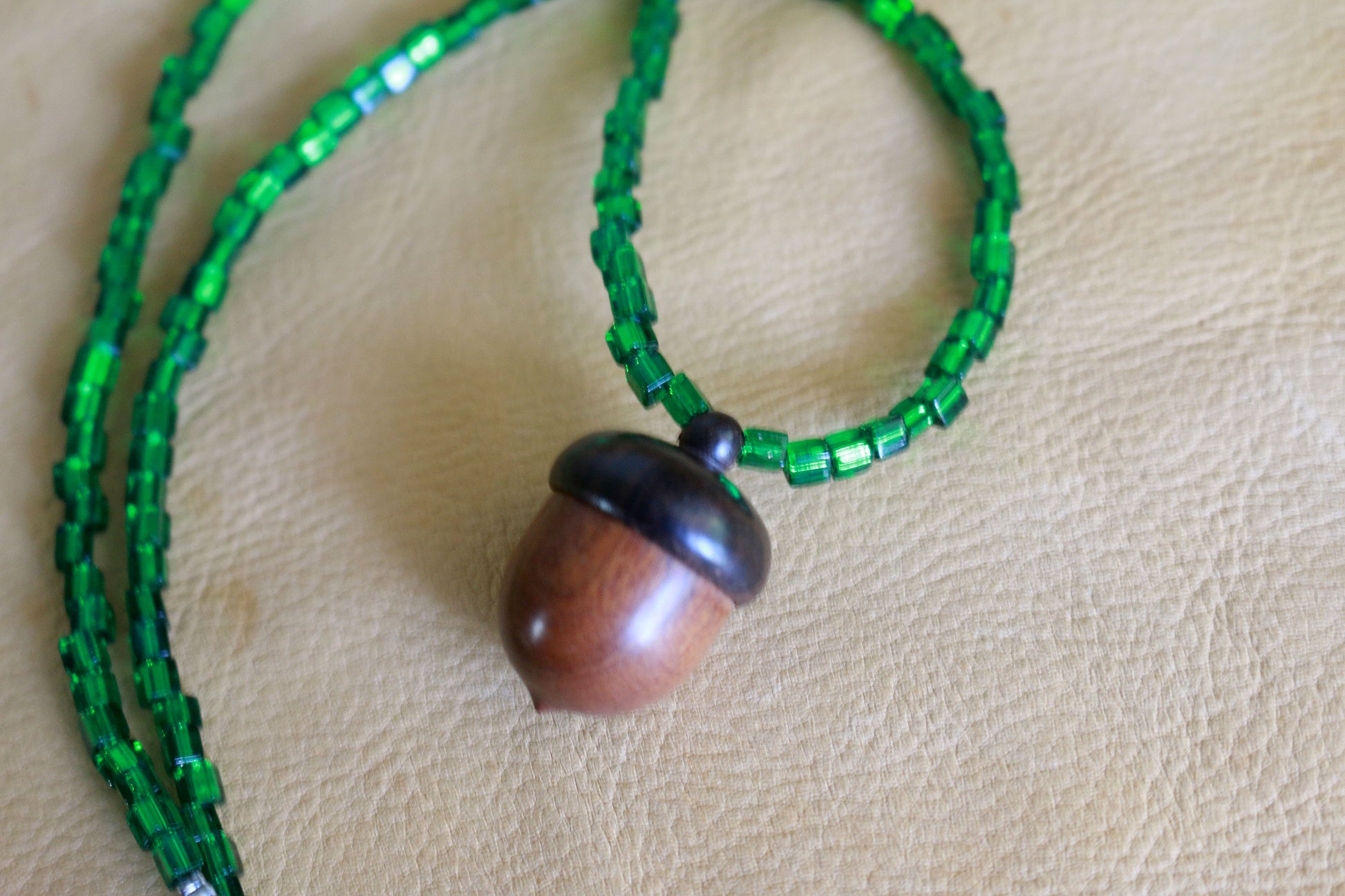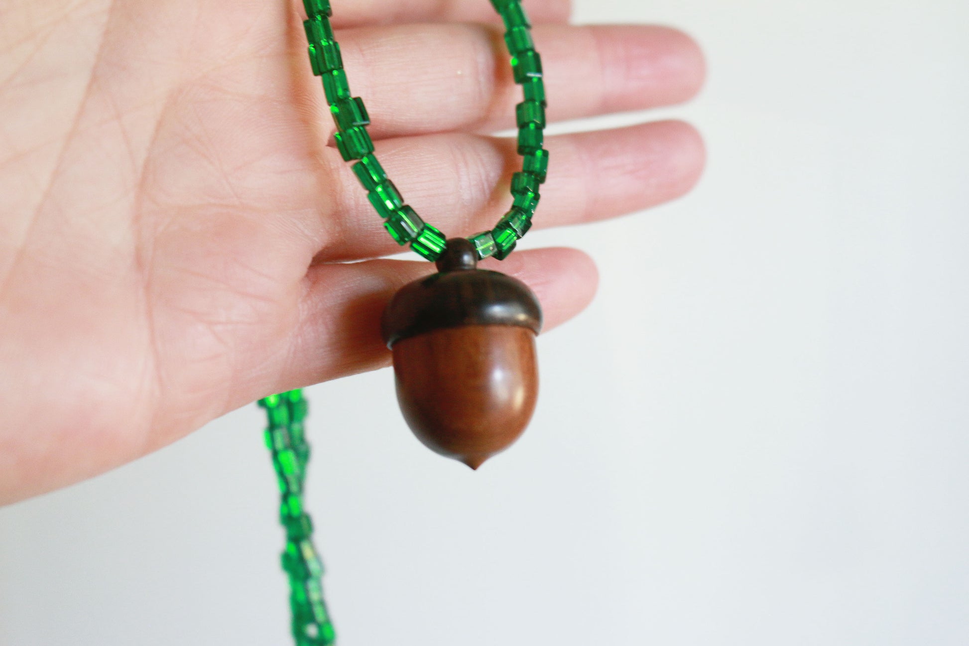 This necklace features a wooden acorn locket/stash container with glass beads. The acorn measures at 1" and the unclasped necklace is 28" length. The necklace measures 15" from clasp to the bottom of the acorn.