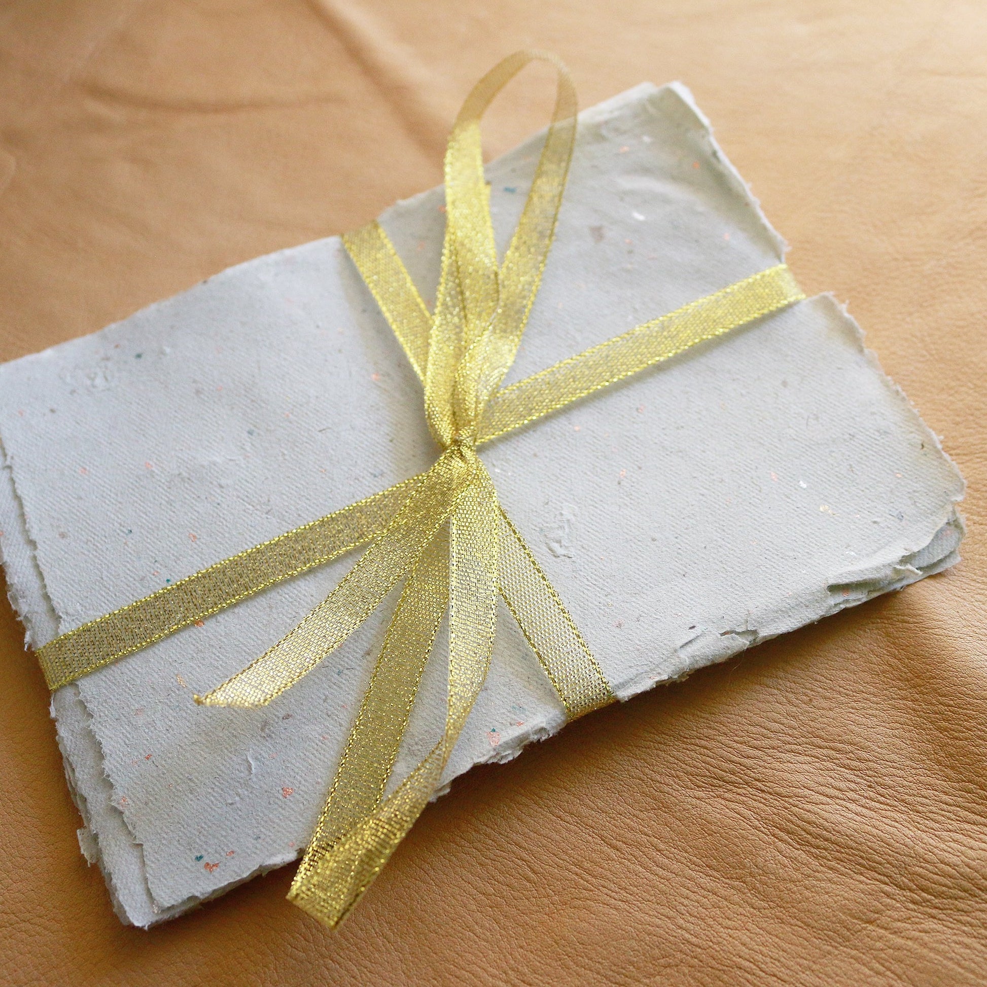 Pack includes 5 ribbon wrapped, 7" x 5" paper sheets are handmade from recycled paper.