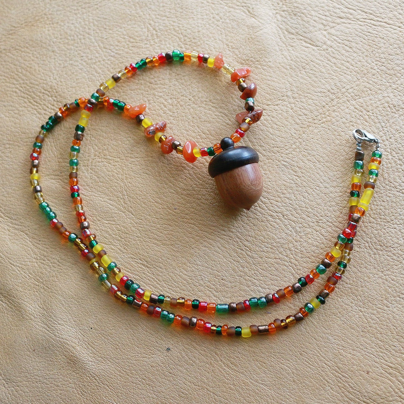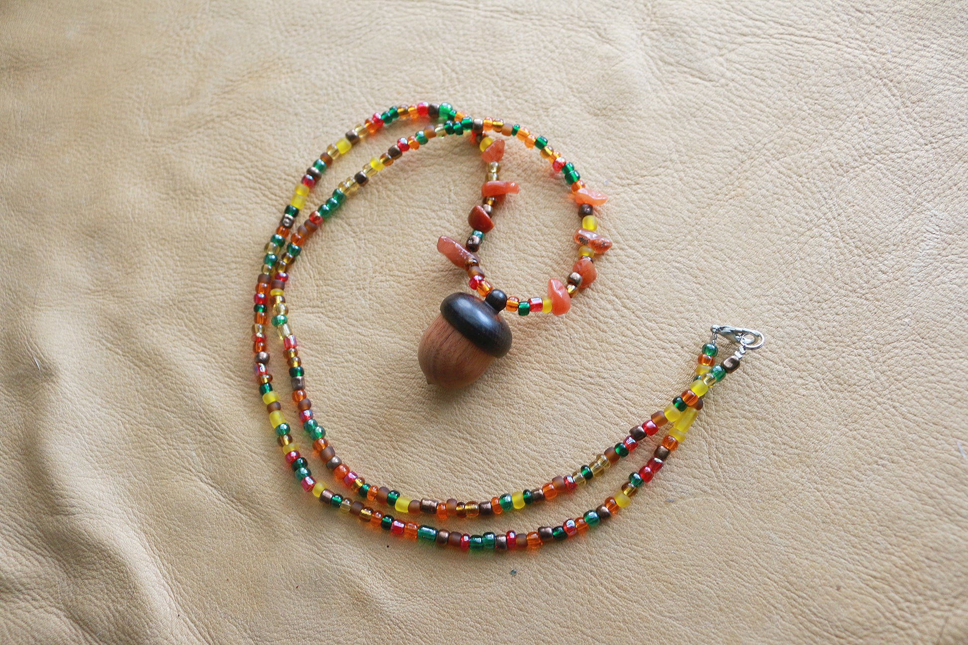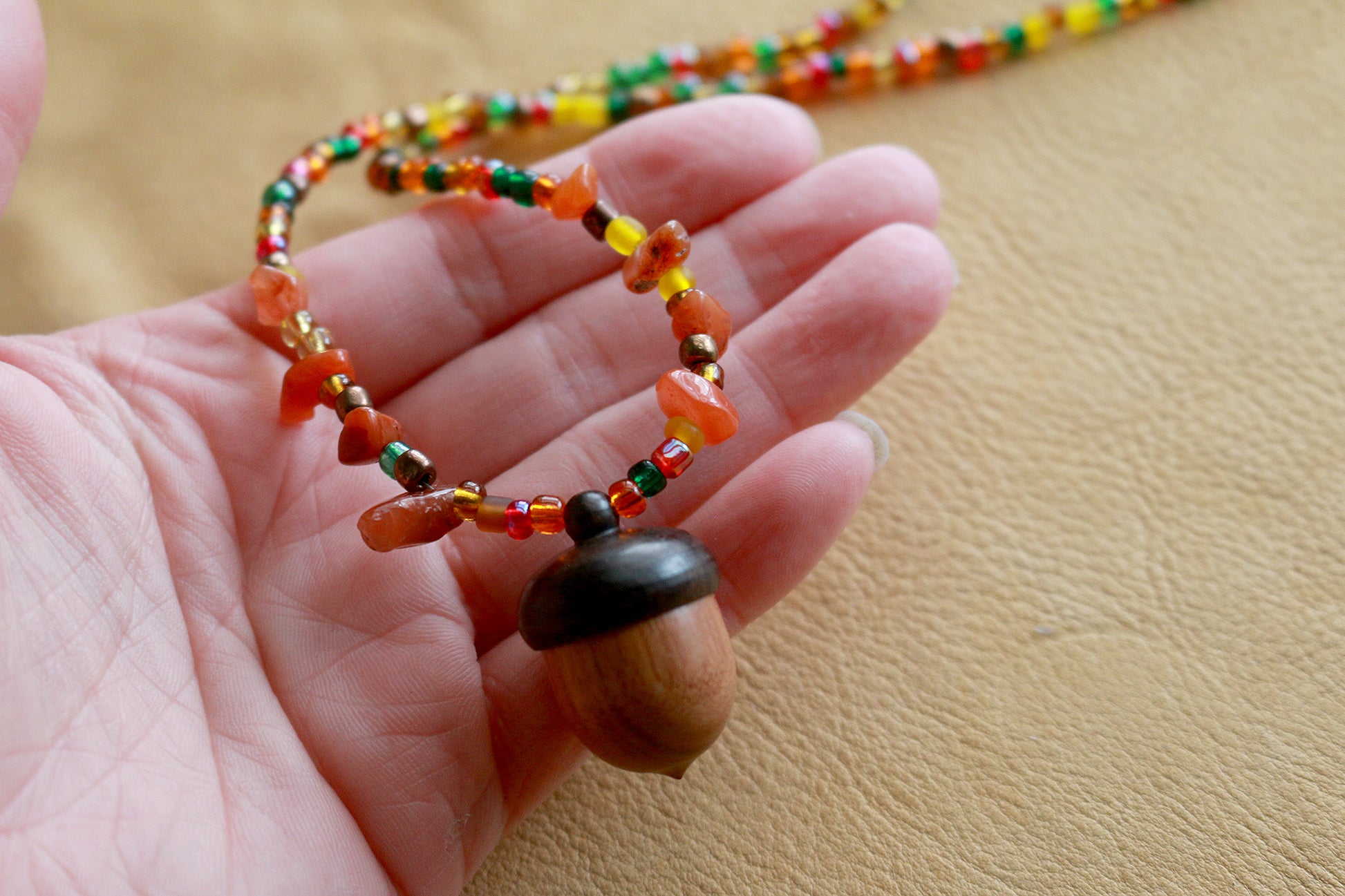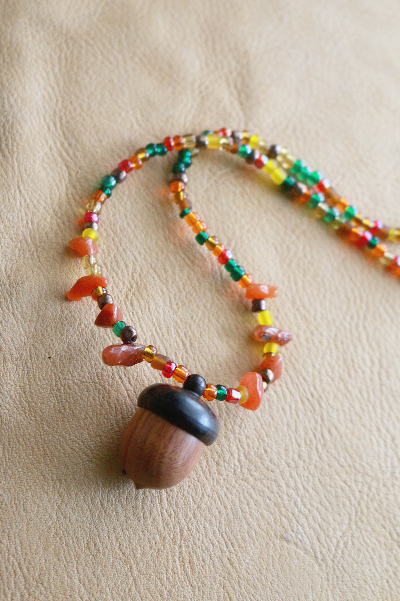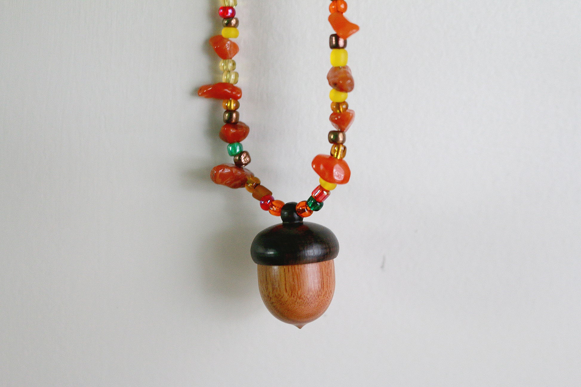 This necklace features a wooden acorn locket/stash container with glass beads. The acorn measures at 1" and the unclasped necklace is 28" length. The necklace measures 15" from clasp to the bottom of the acorn.