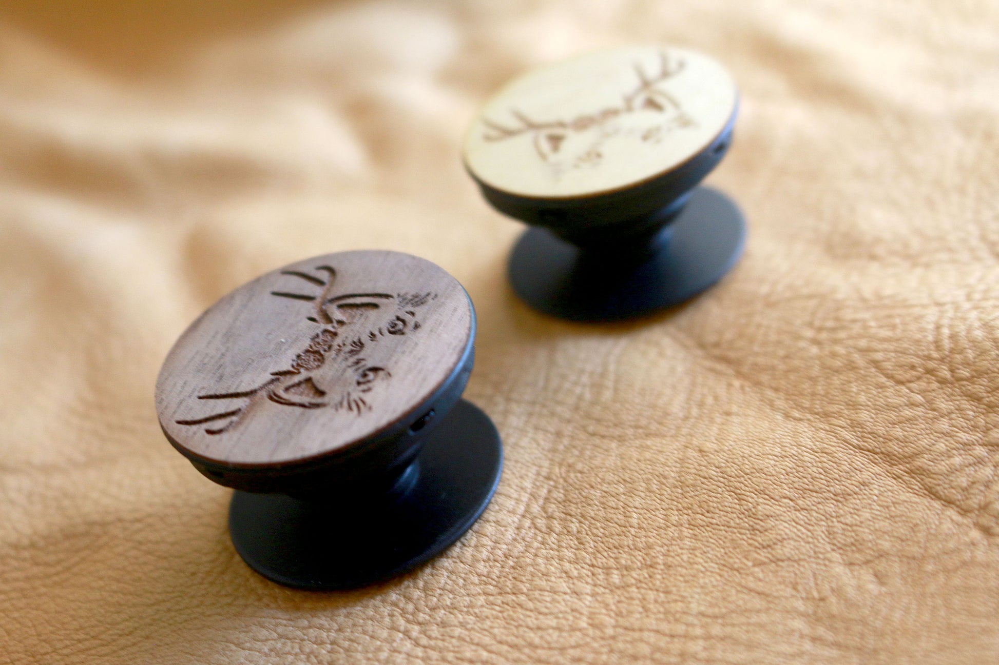 Wooden pop phone grip socket featuring the OmniFeral logo.