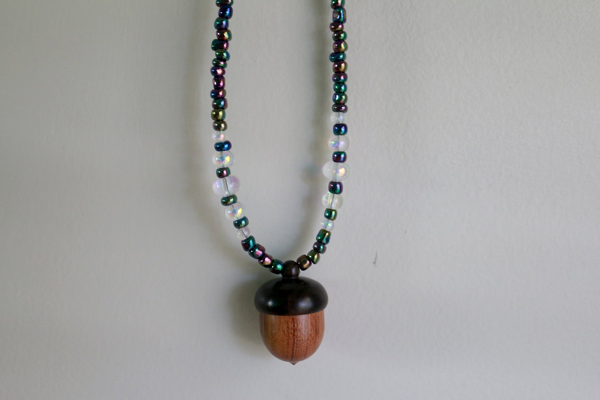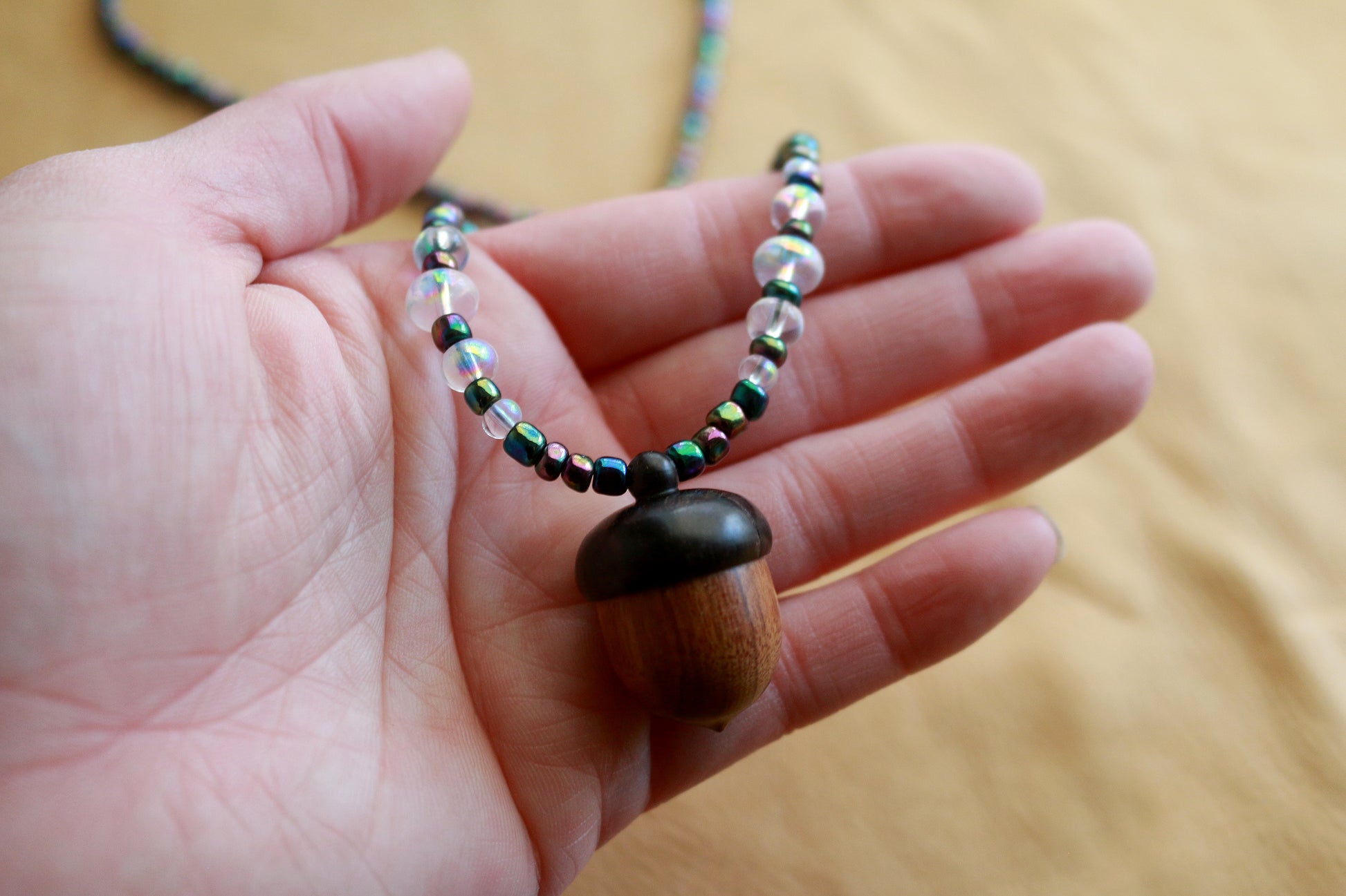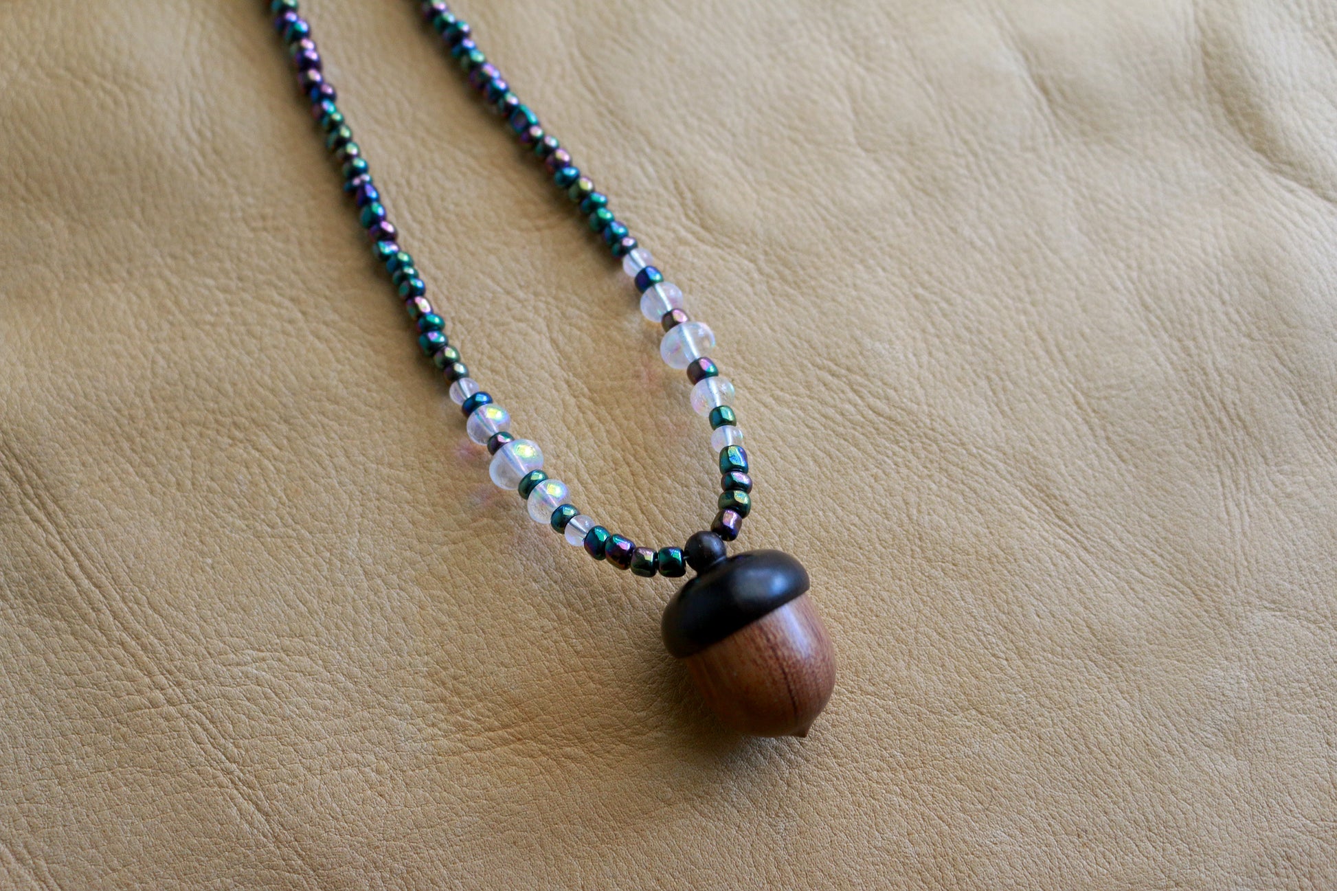 This necklace features a wooden acorn locket/stash container with glass beads. The acorn measures at 1" and the unclasped necklace is 28" length. The necklace measures 15" from clasp to the bottom of the acorn.