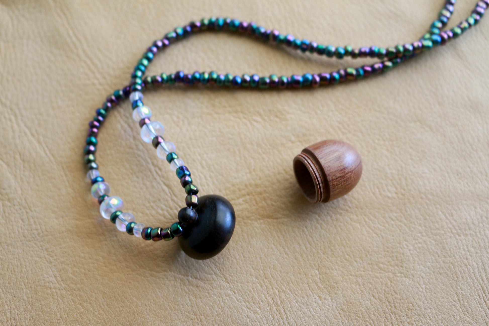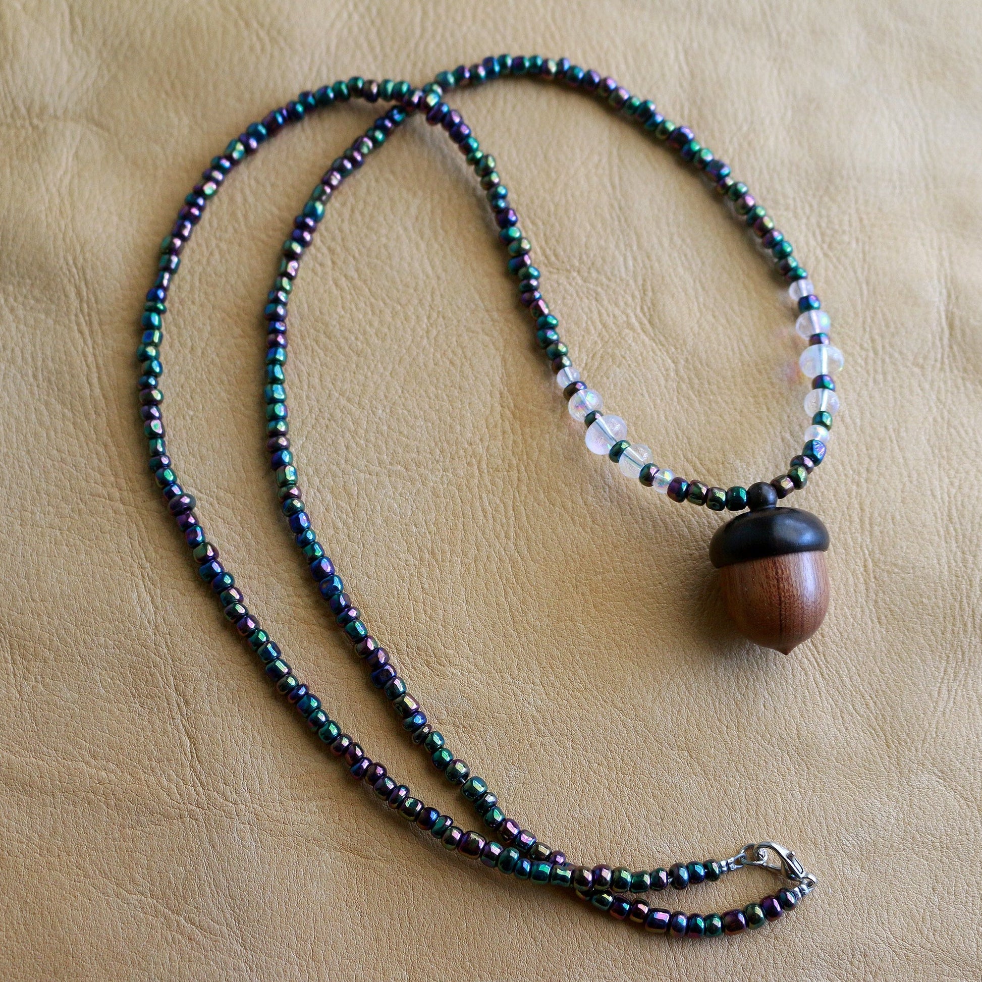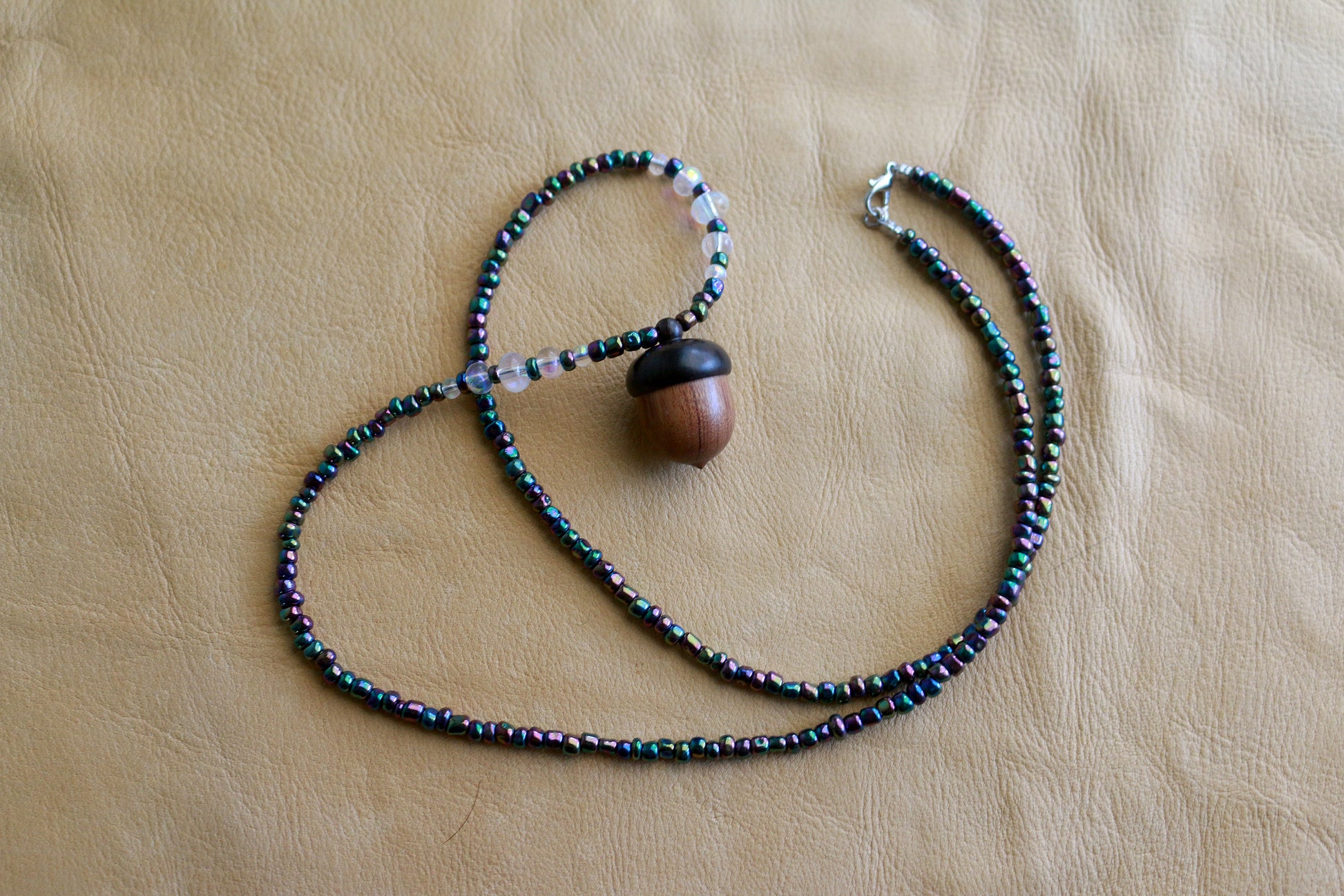 This necklace features a wooden acorn locket/stash container with glass beads. The acorn measures at 1" and the unclasped necklace is 28" length. The necklace measures 15" from clasp to the bottom of the acorn.