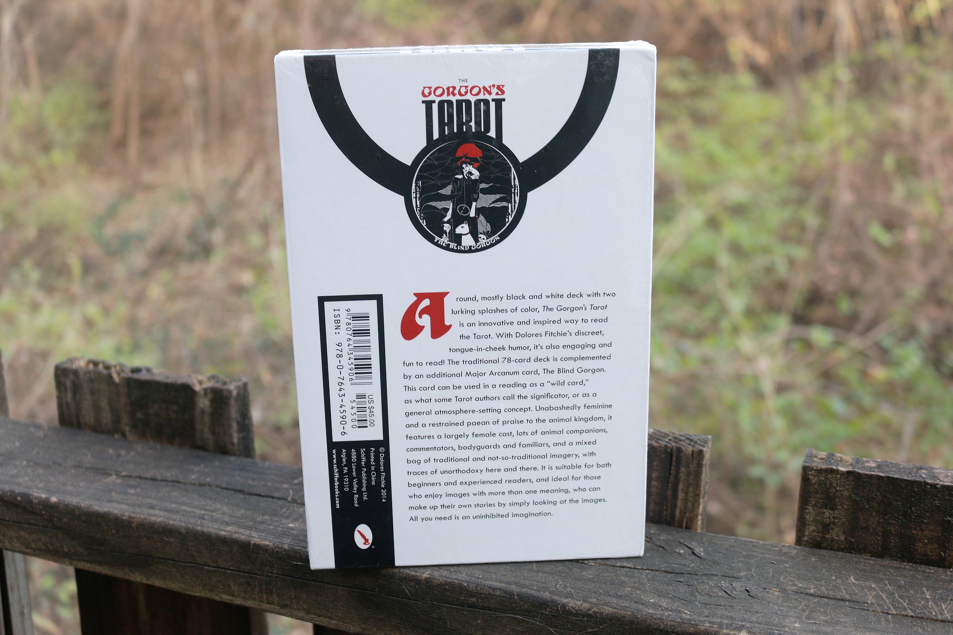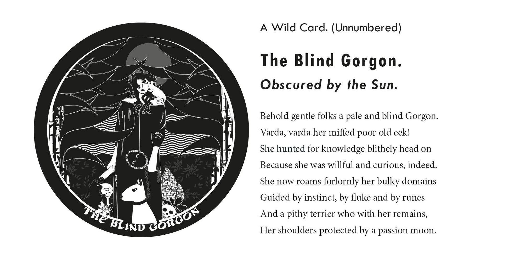 The deck features bold black-and-white illustrations with two restrained splashes of color. At its center is The Blind Gorgon—an unnumbered card that can function as a wildcard, significator, or atmosphere-setter.
