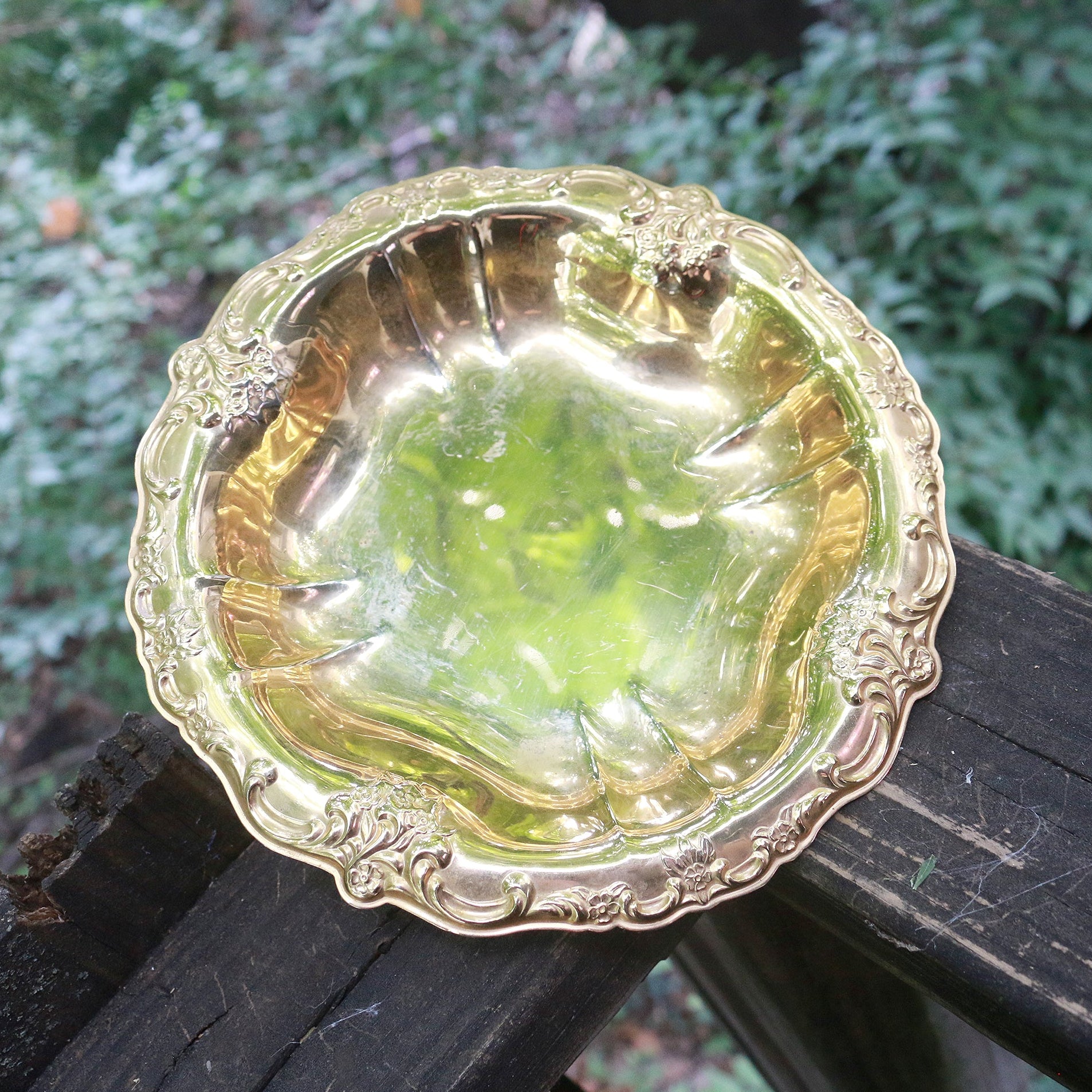 This secondhand find is a brass plate tray measuring at 7.5" wide x 1" tall. It's the perfect addition to an elegant altar collection.