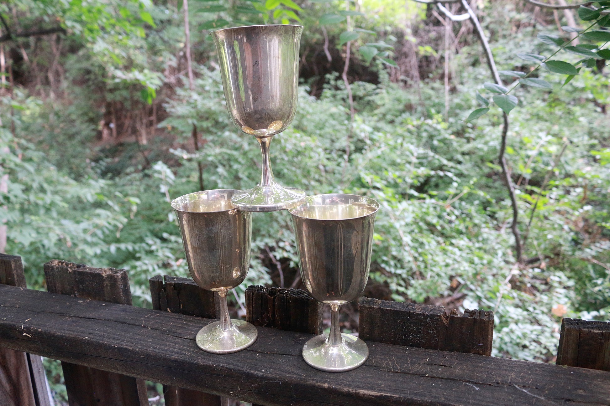 This secondhand find is a silver plate metal goblet measuring at 6" tall x 3.5" wide. It's the perfect addition to an elegant altar collection.
