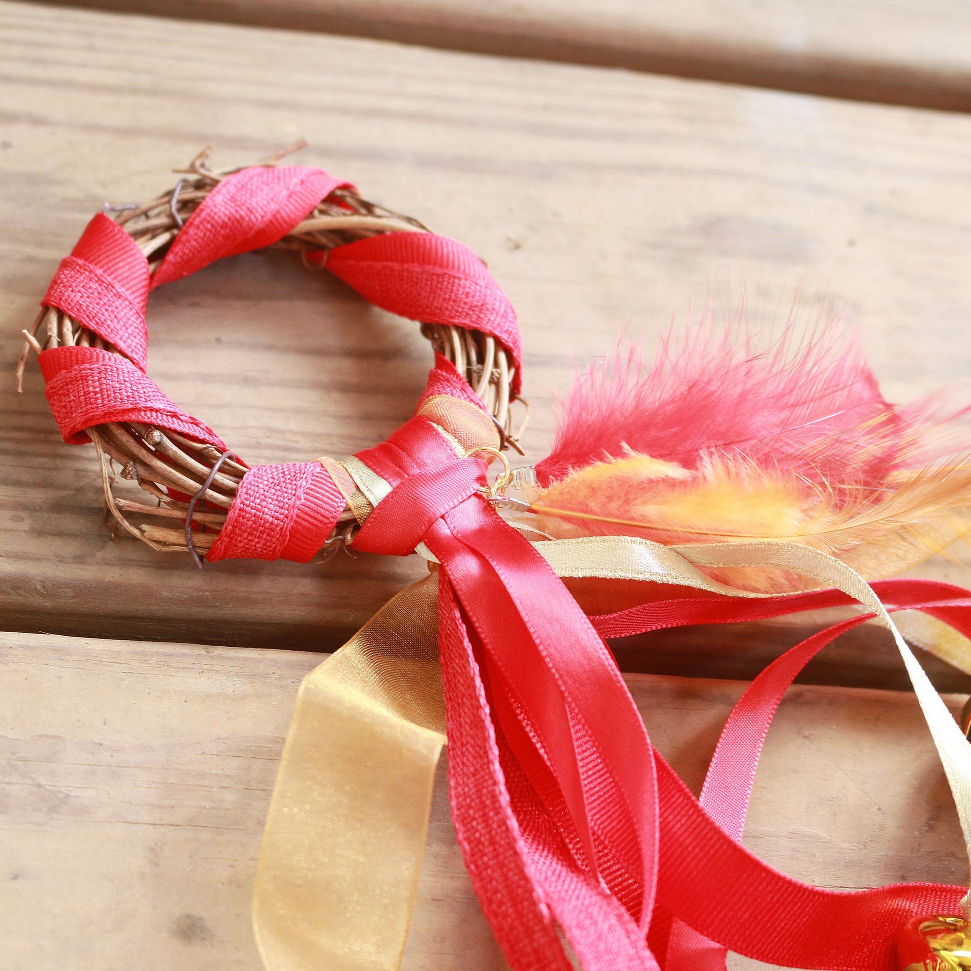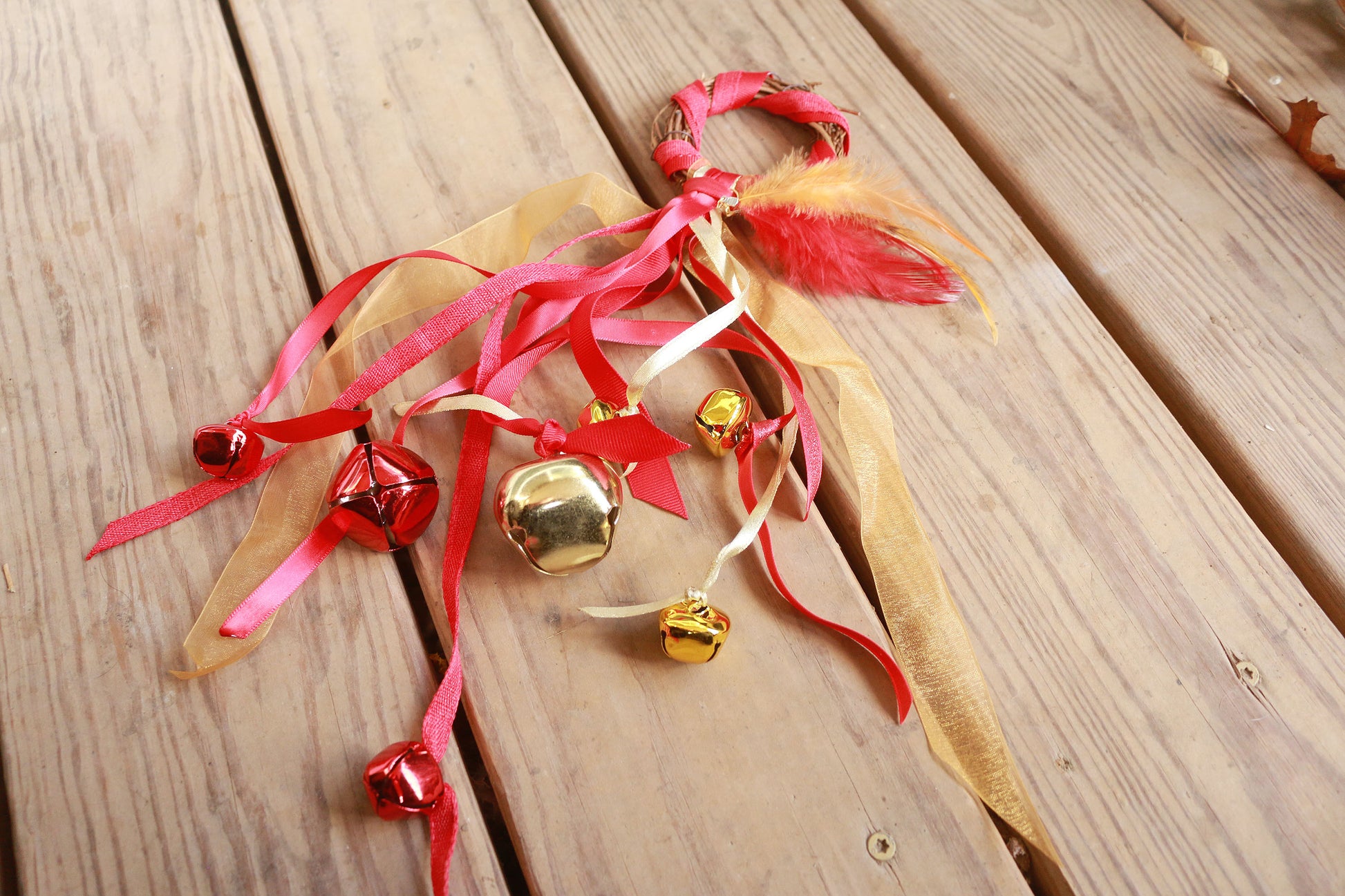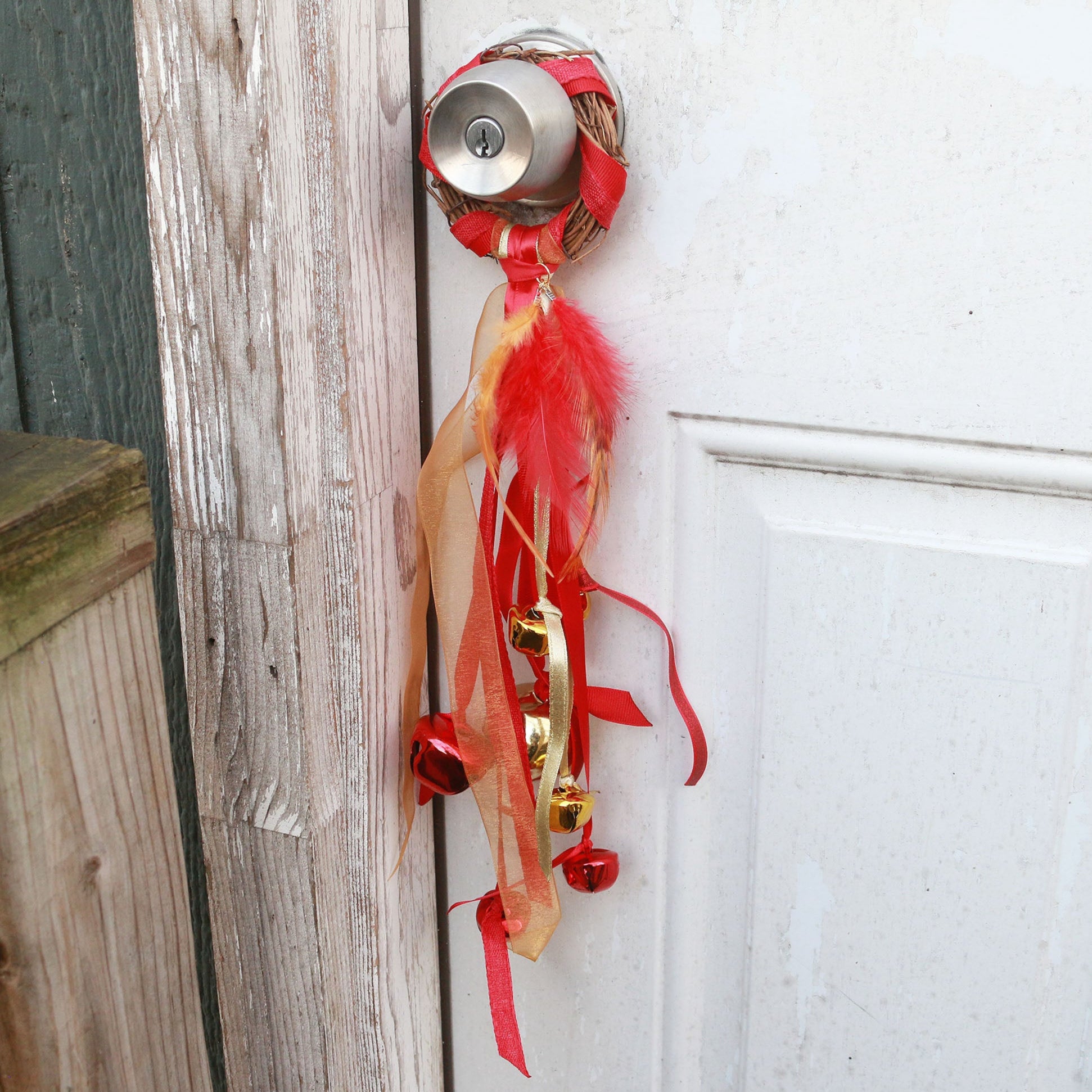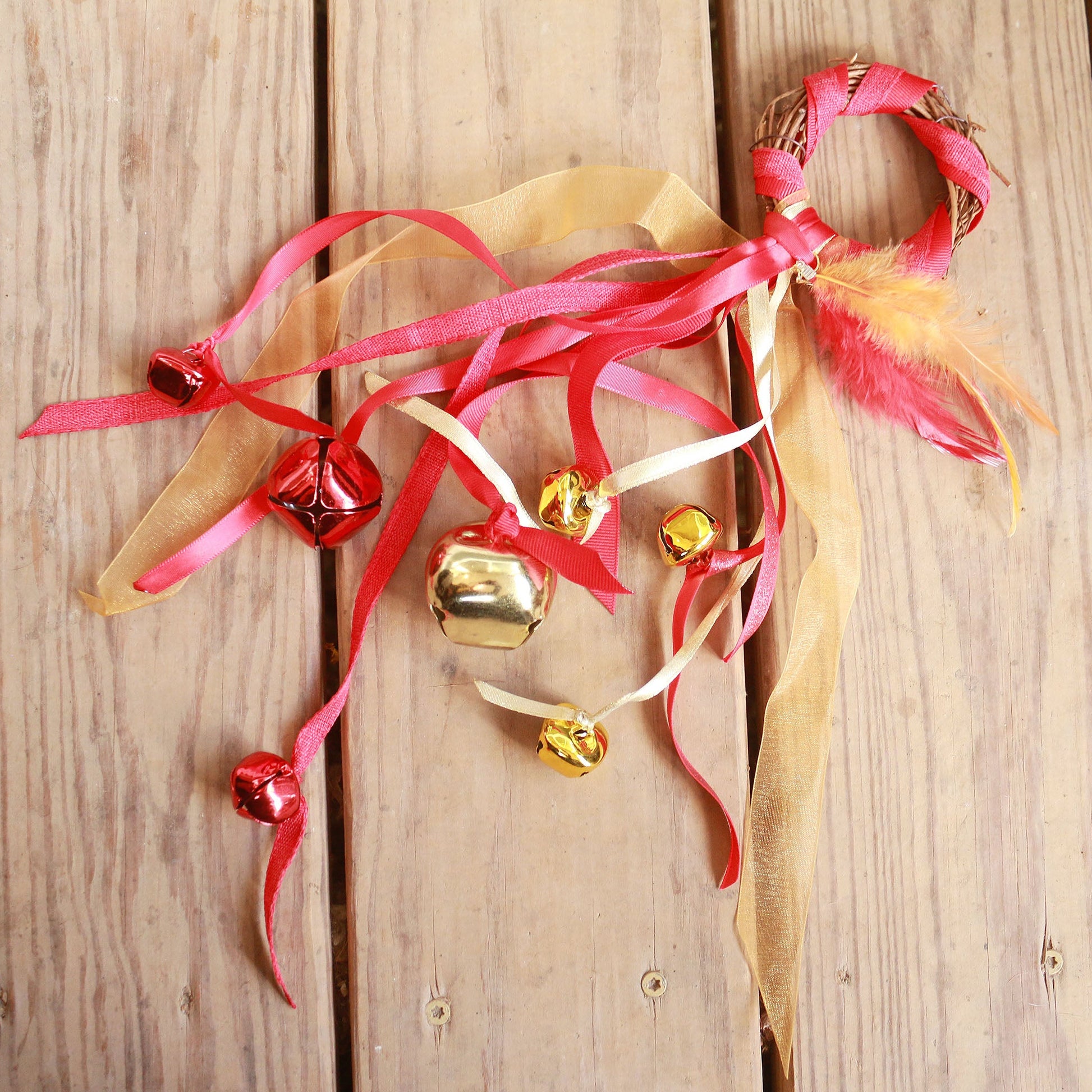 Handmade with ribbon and feathers, grapevine wreath with brass bells.