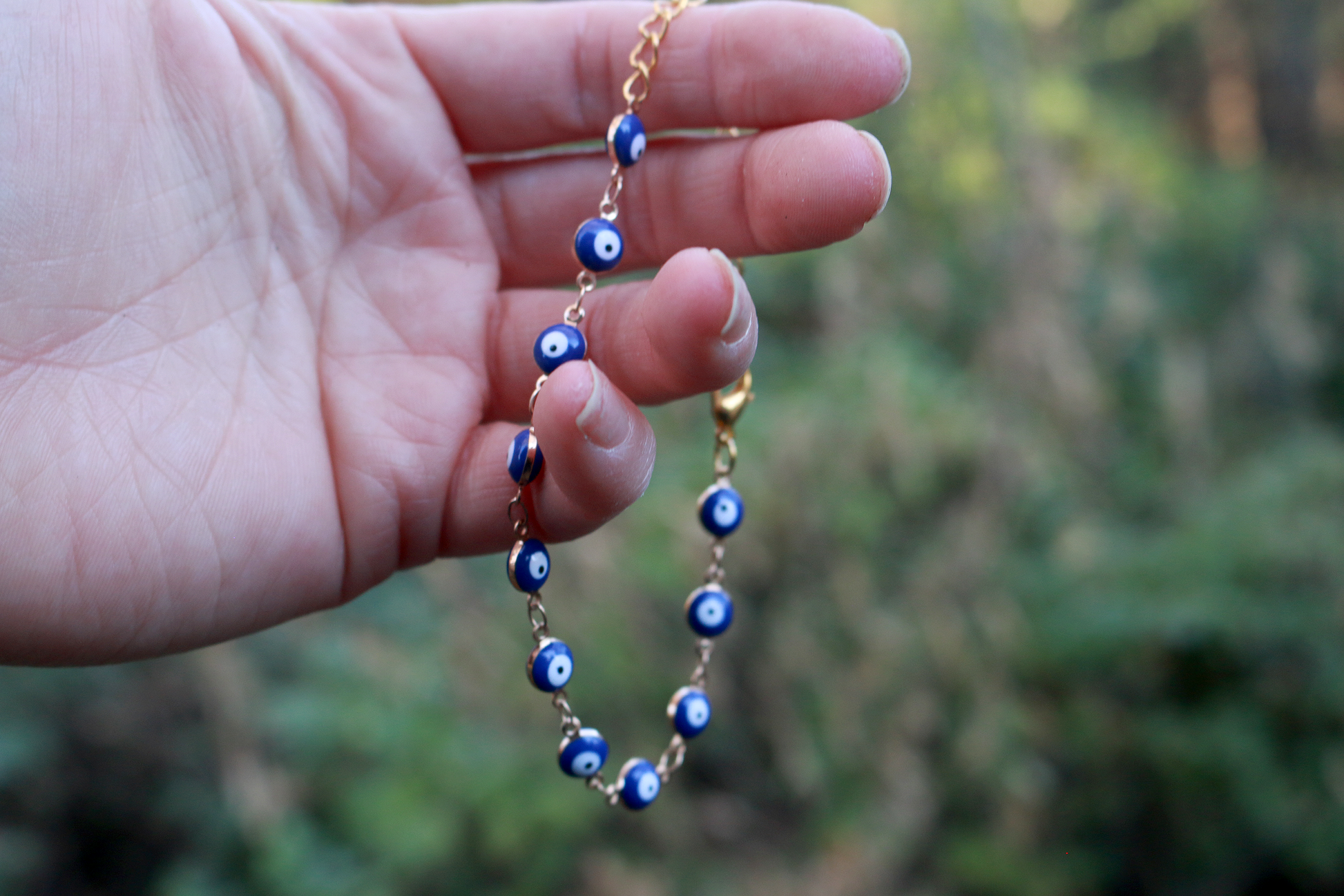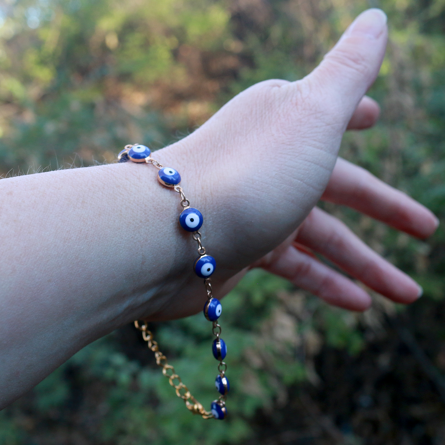 This delicate gold + dark blue bracelet features the Mal de ojo symbology.