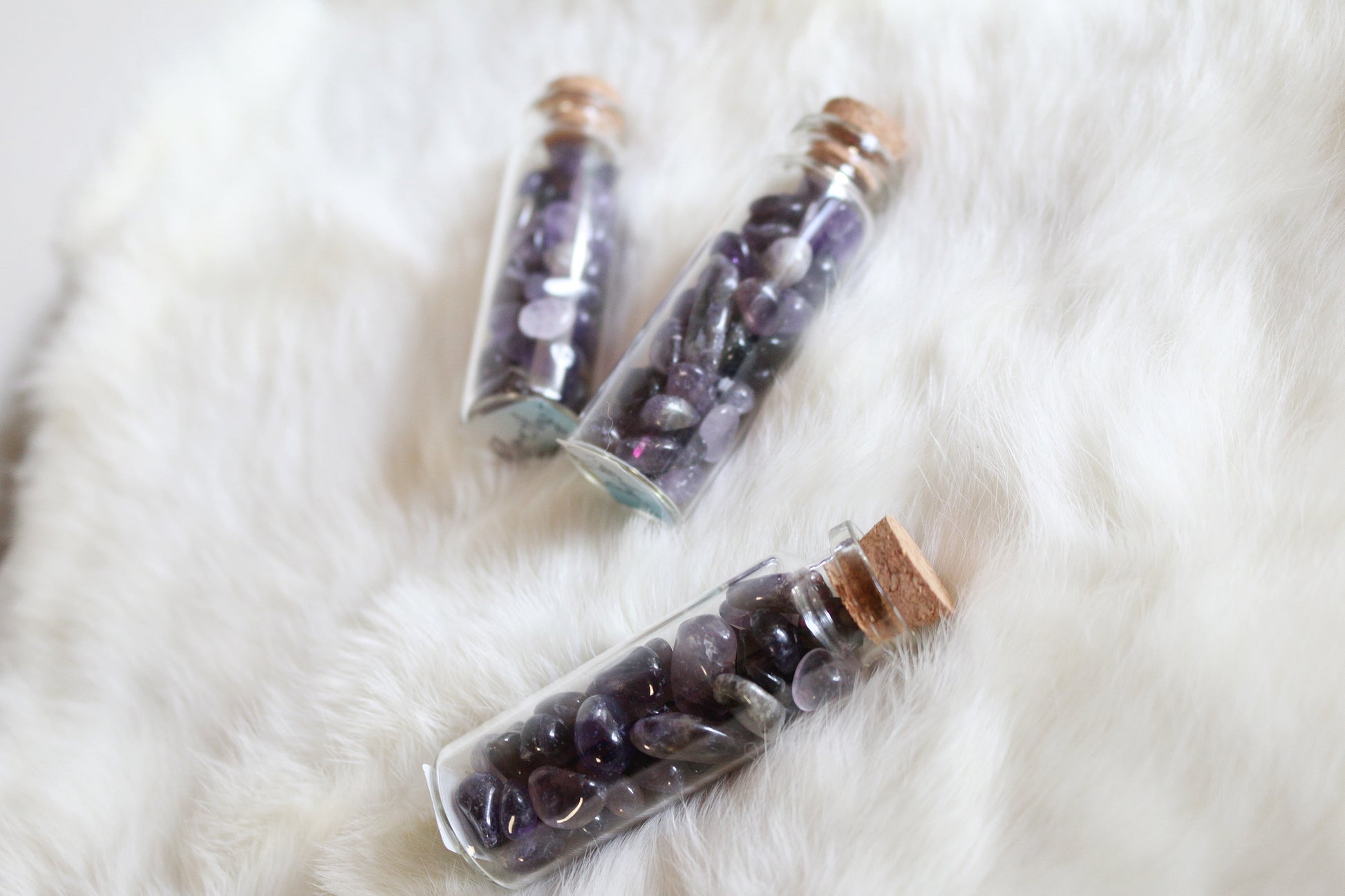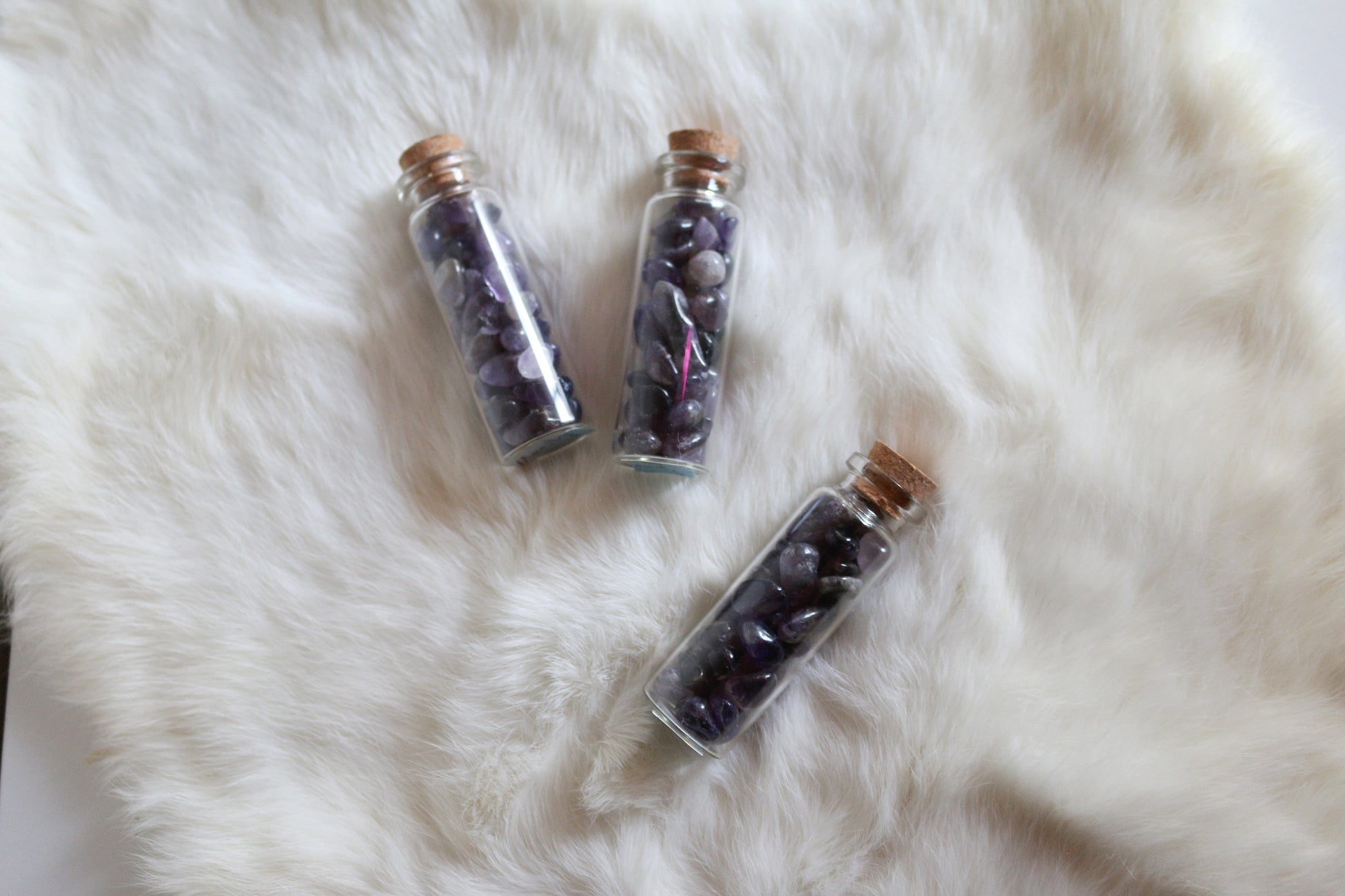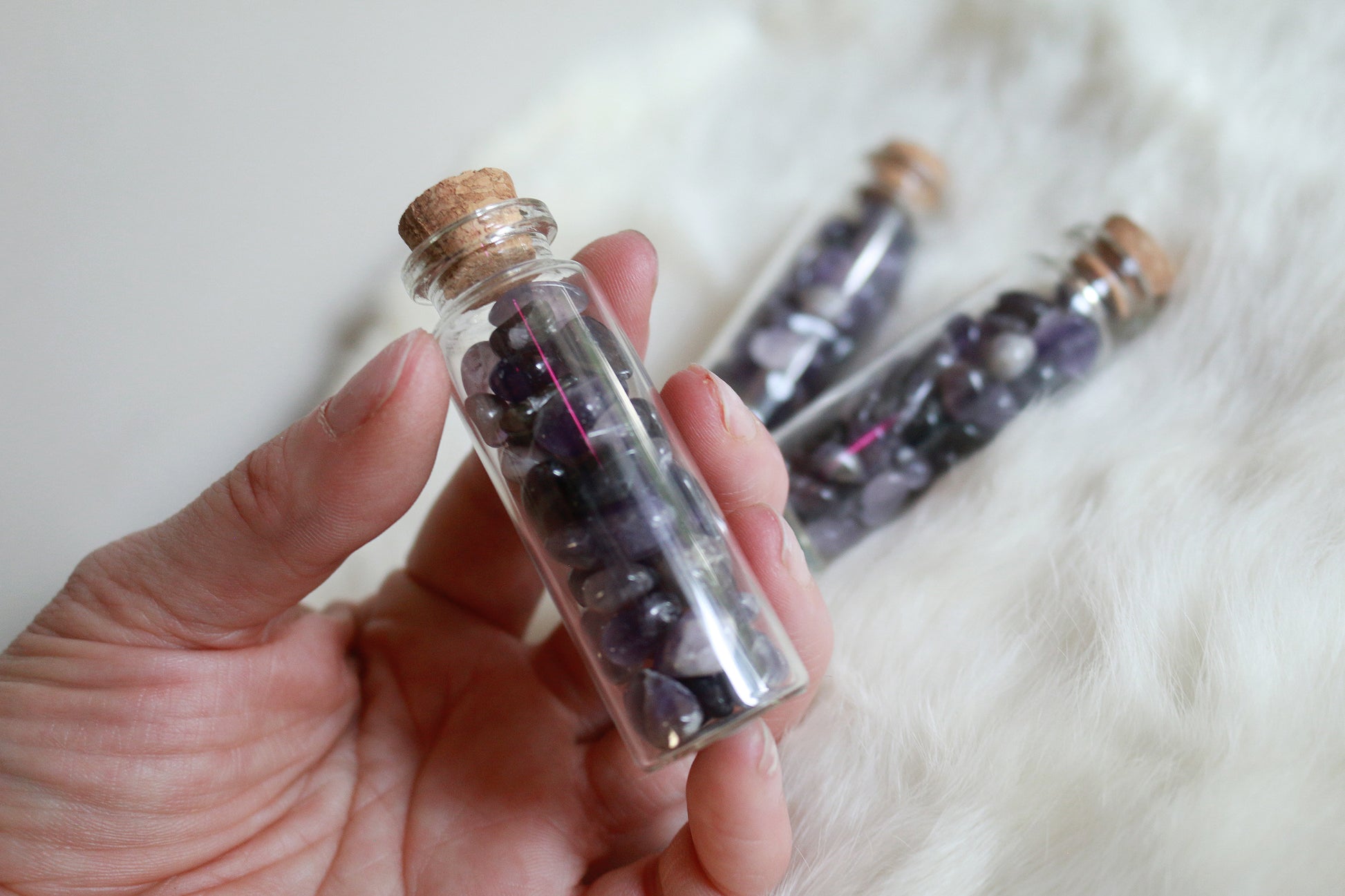 A small charming jar, 2" x 1", filled with tumbled crystal chips. Useful for witch bottles, spell jars and other ritual practices.