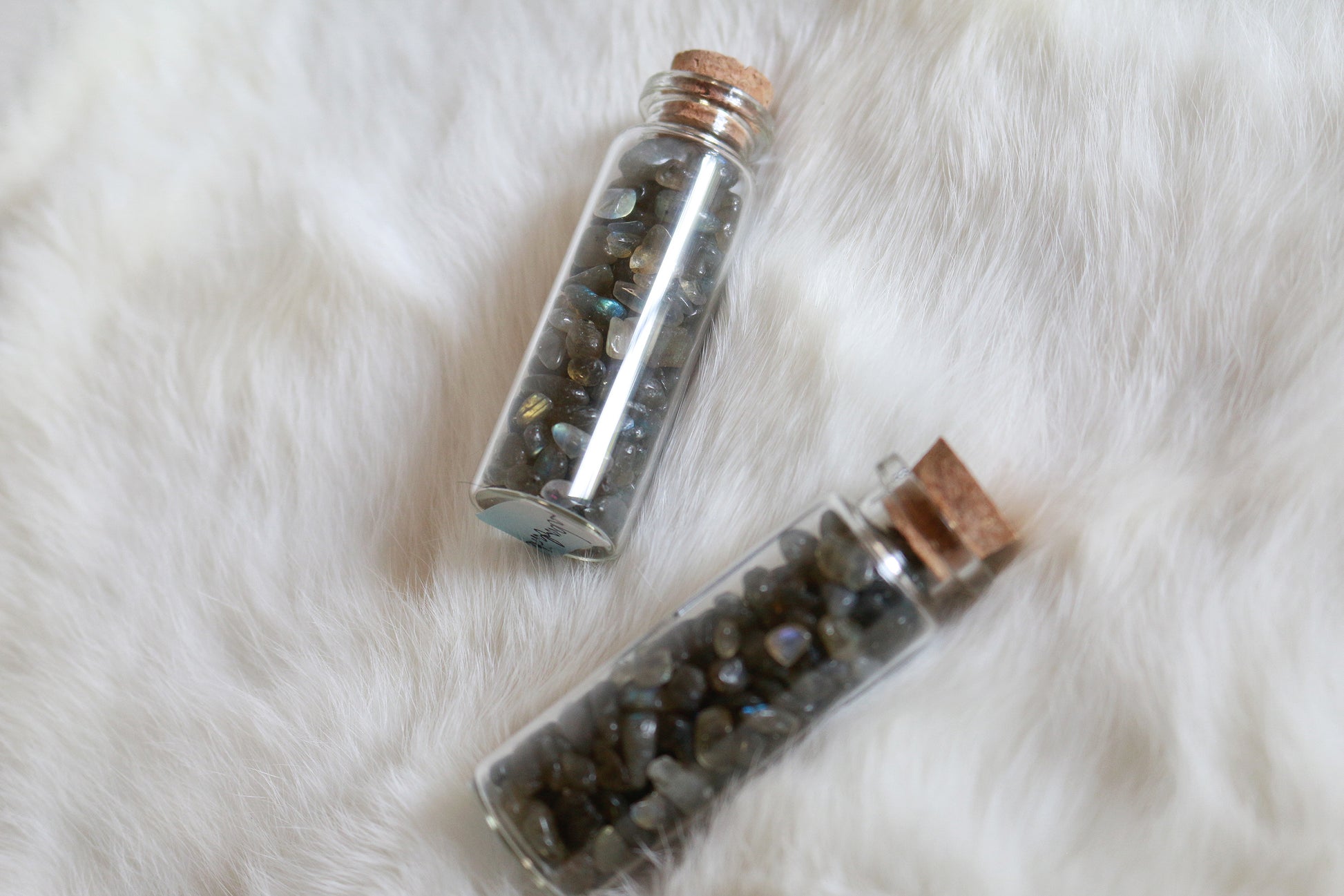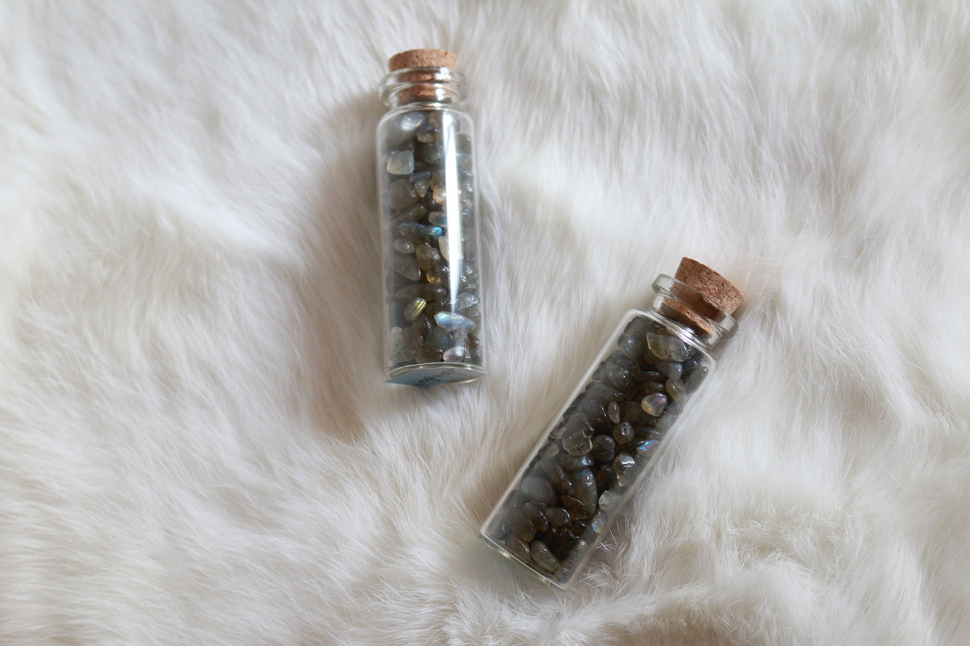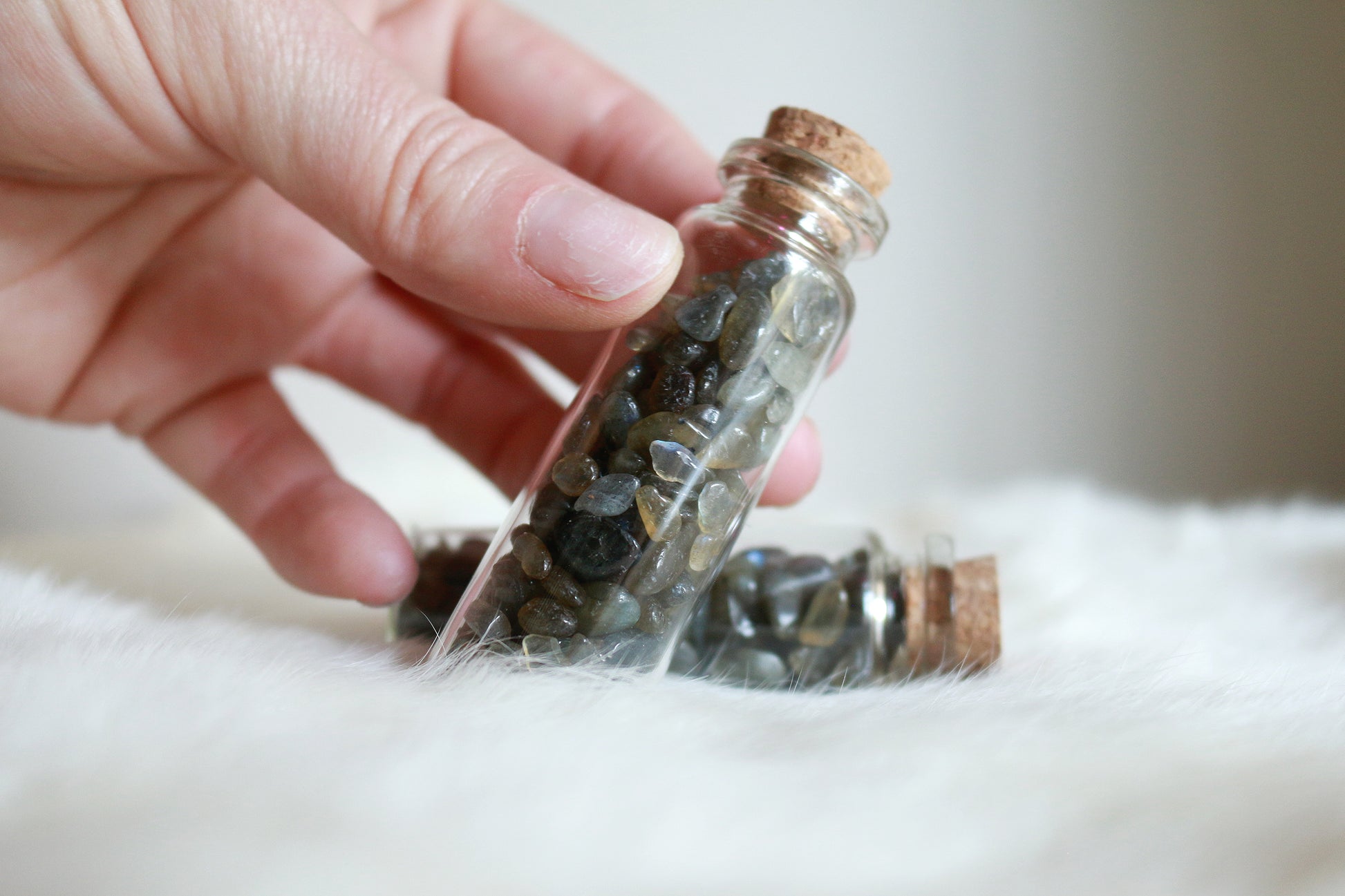 A small charming jar, 2" x 1", filled with tumbled crystal chips. Useful for witch bottles, spell jars and other ritual practices.