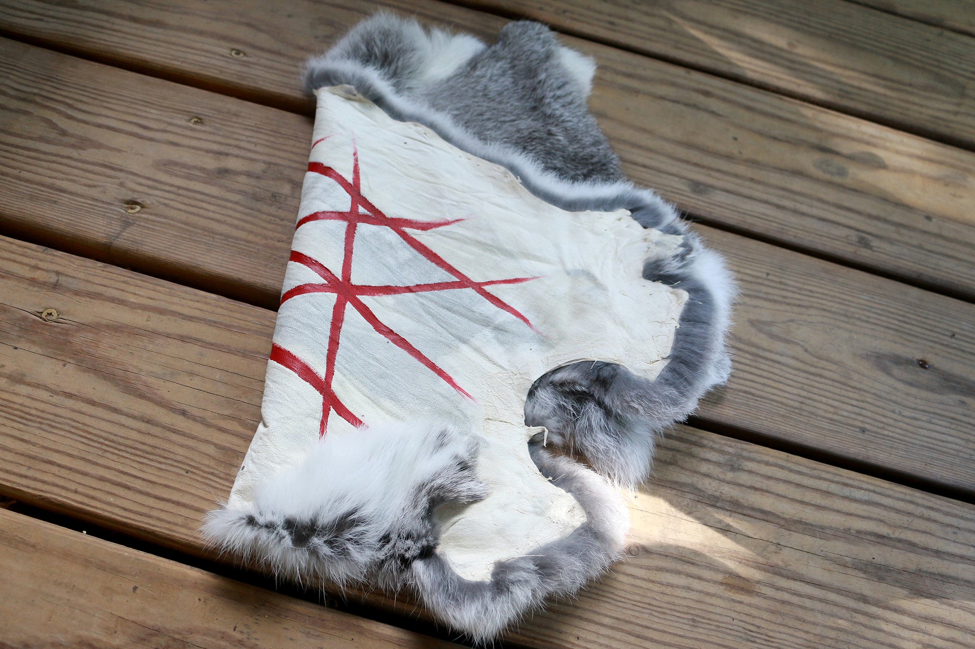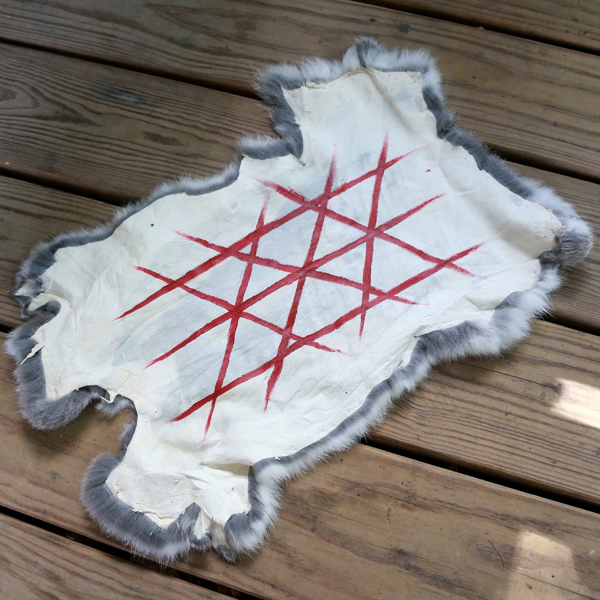 The "Web of Wyrd" is hand painted on an ethically sourced rabbit hide, a unique altar cloth for those who are more wild at heart. Pelt size: 17in x 11in.